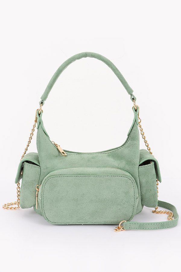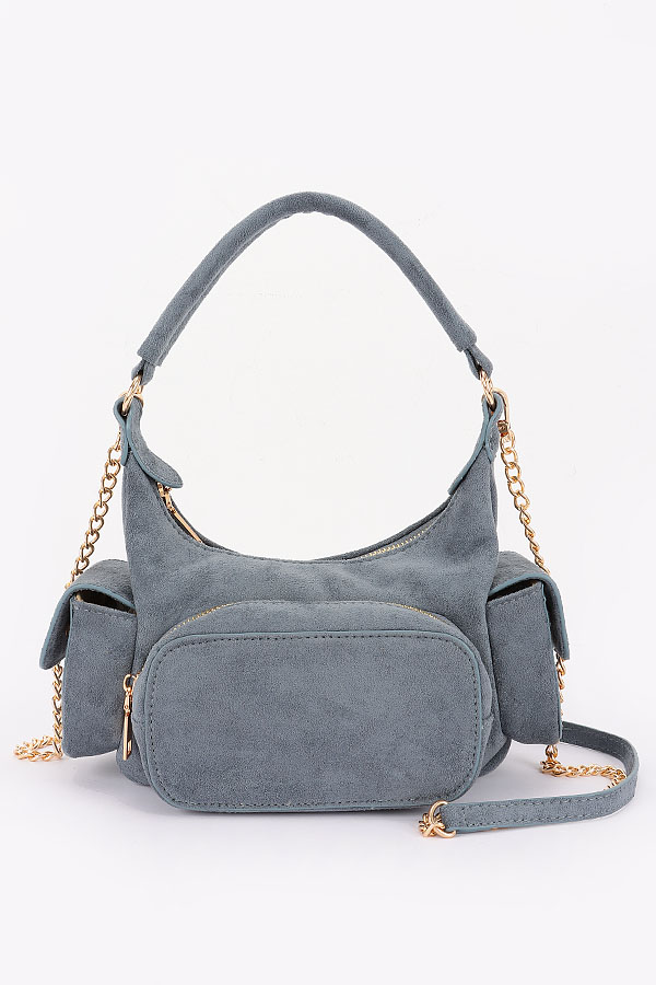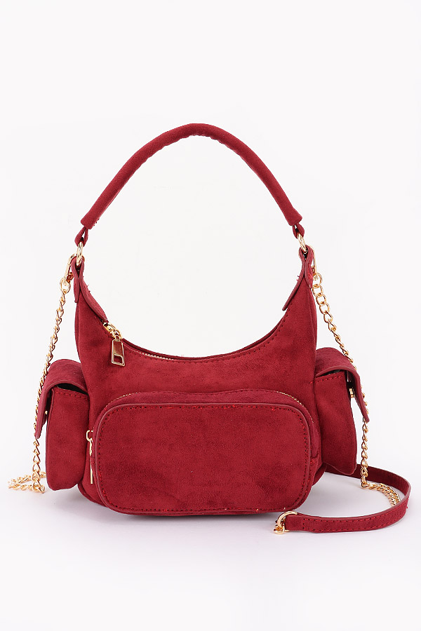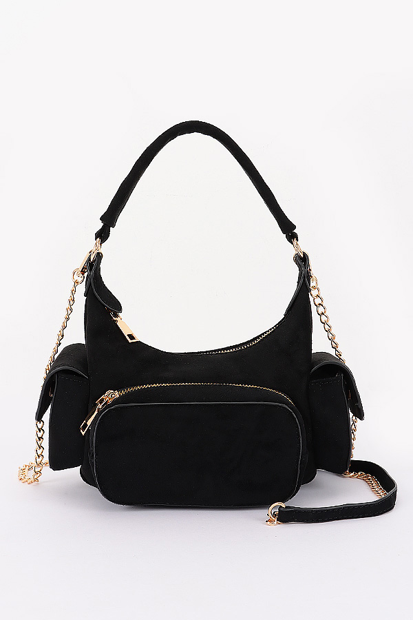 • * This Chain Strap Suede Shoulder Bag from H&D Accessories features a stylish design with chain straps and multiple compartments. The suede material gives it a soft and luxurious feel, while the structured shape adds a touch of elegance.