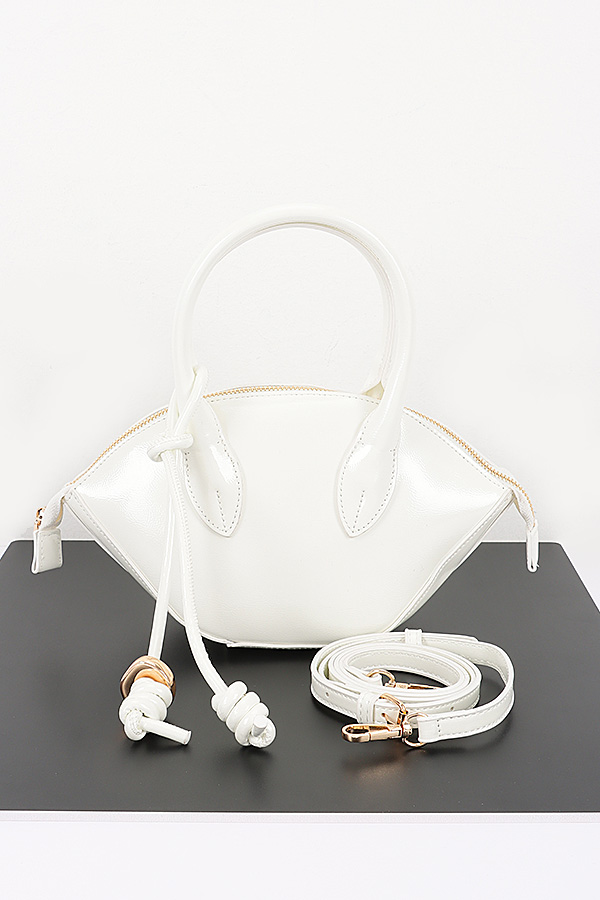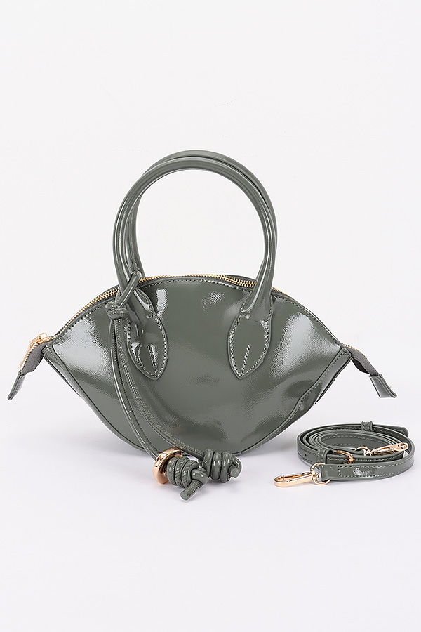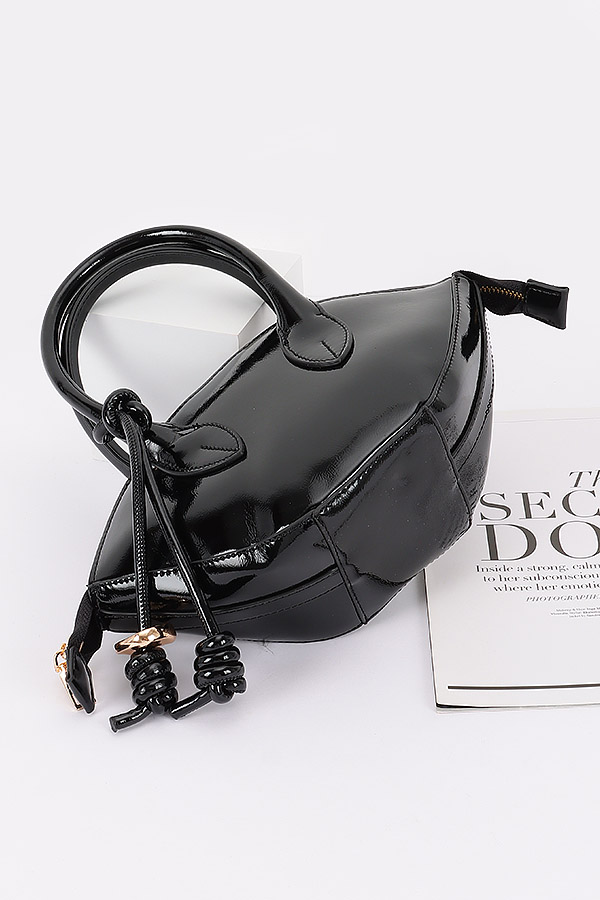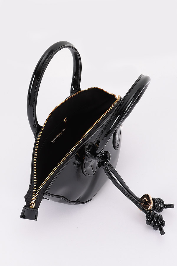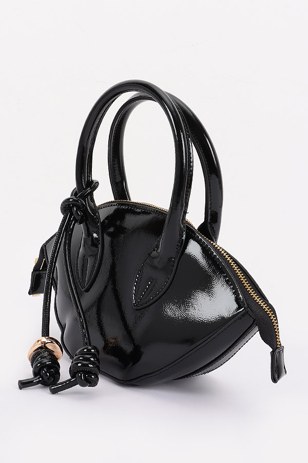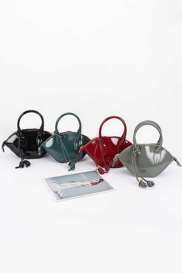 - * This Patent Leather Top Handle Bag from H&D Accessories has a sleek, curved silhouette. It features a top handle, a decorative knotted strap detail, and a detachable shoulder strap. The patent leather gives it a shiny, polished look.