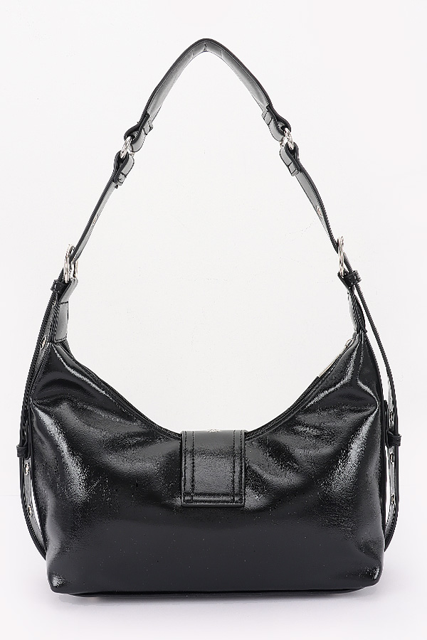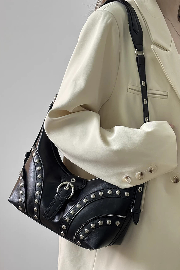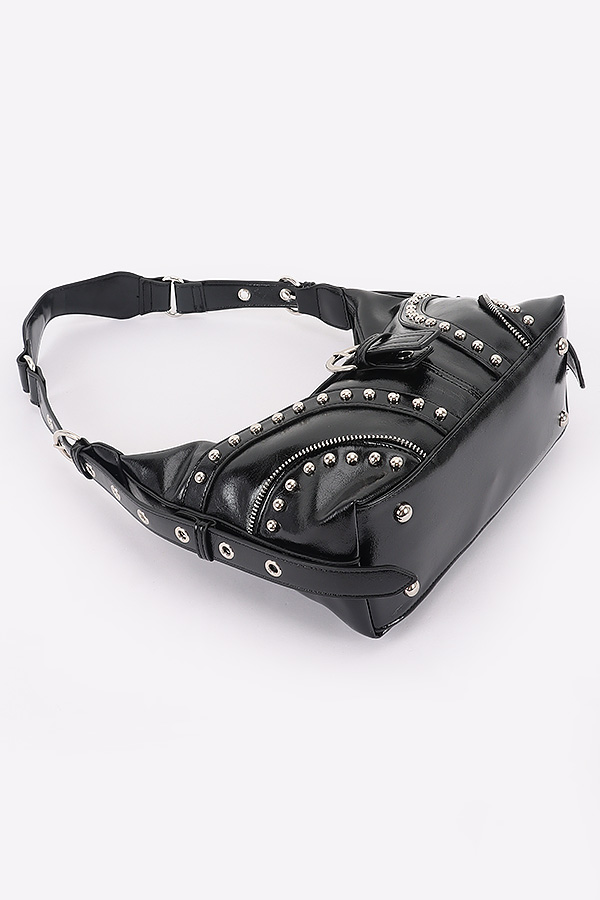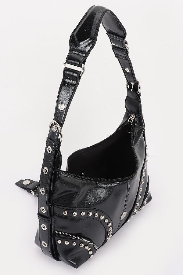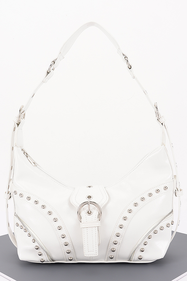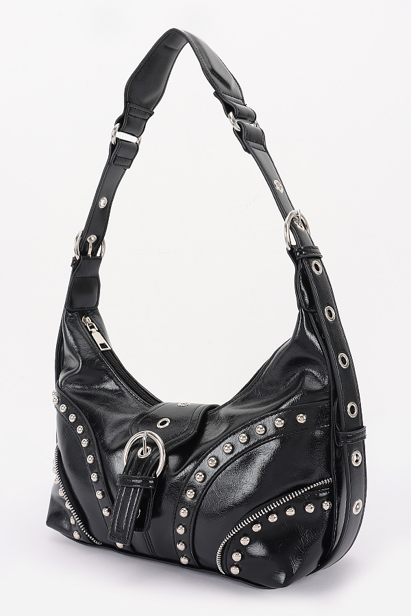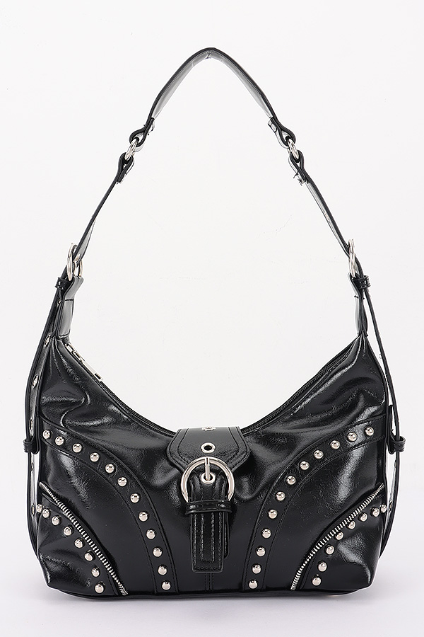 - * This Faux Leather Metal Buckle Shoulder Bag from H&D Accessories features a sleek design with metal studs and a prominent metal buckle detail. It has a spacious interior and an adjustable shoulder strap, combining edgy style with practicality.