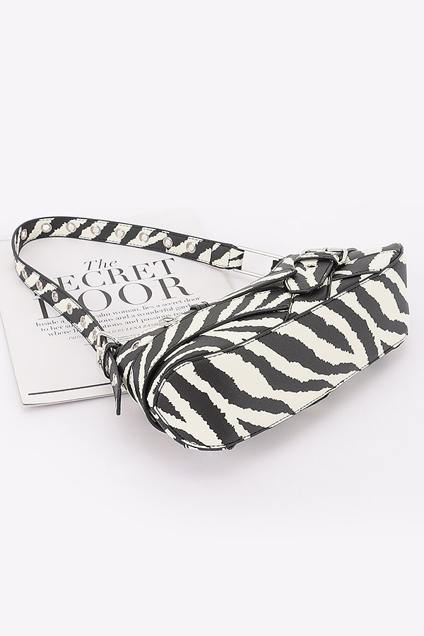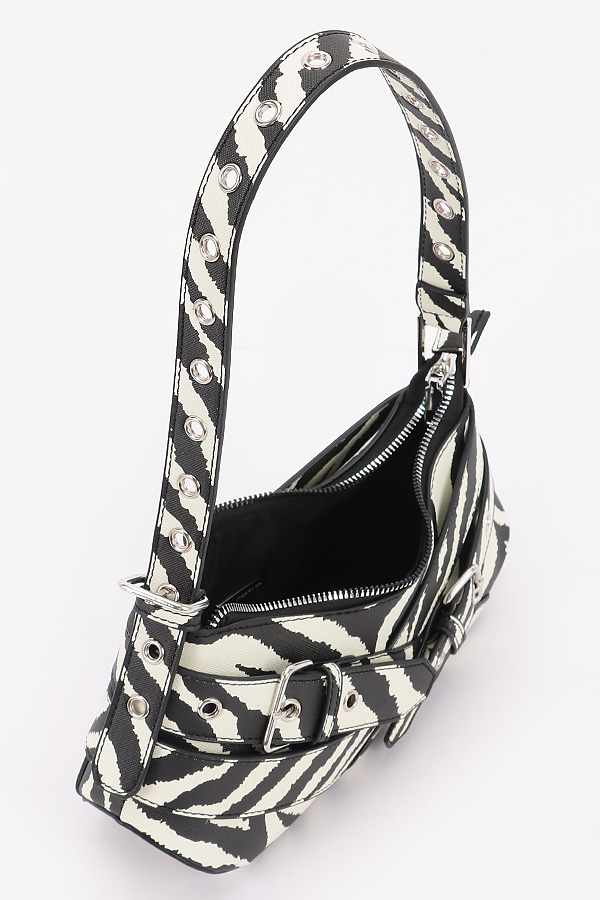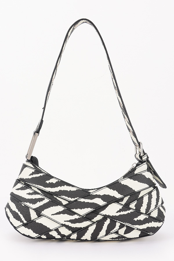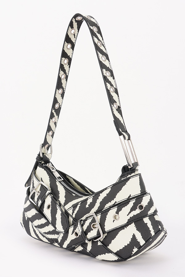 - * This is a Faux Leather Multi - Metal Shoulder Bag from H&D Accessories. Made of textured faux leather with a striking zebra - like pattern, it has a curved, crescent - shaped silhouette. The bag is adorned with multiple metal elements, including chains, buckles, and hardware, adding an edgy and stylish touch. A single shoulder strap allows for easy carrying. Ideal for adding a bold statement to casual or night - out outfits, it suits occasions like street - style outings, concerts, or dinners with friends, pairing well with jeans, dresses, or bold - colored ensembles.