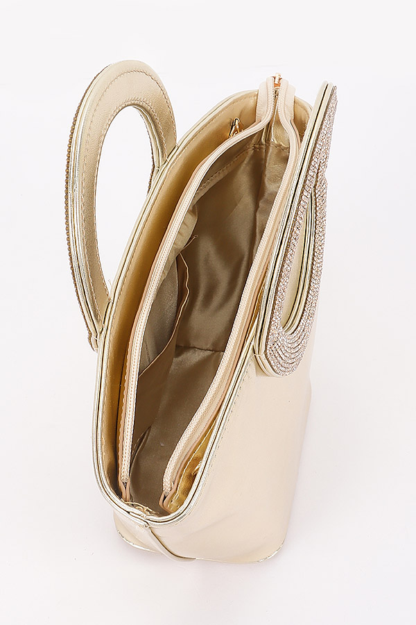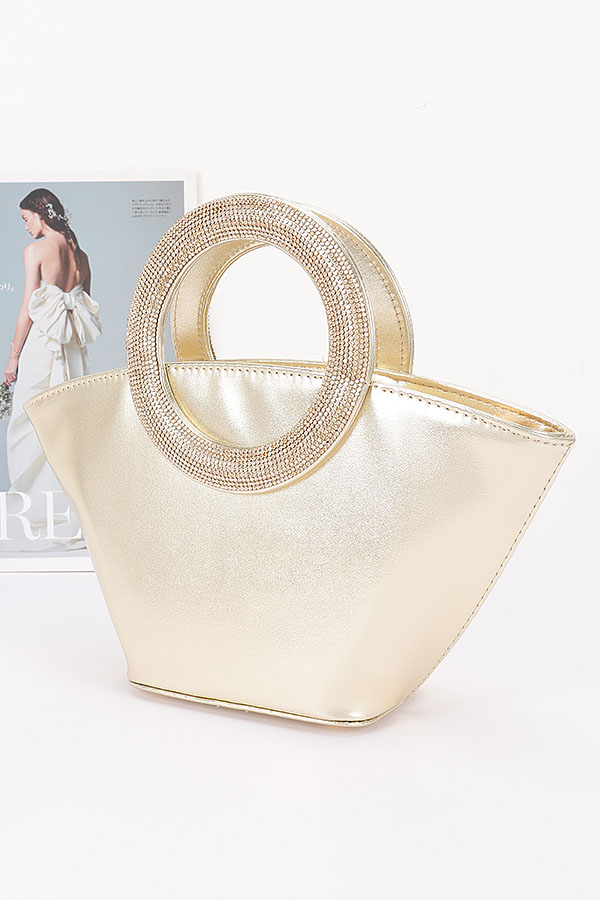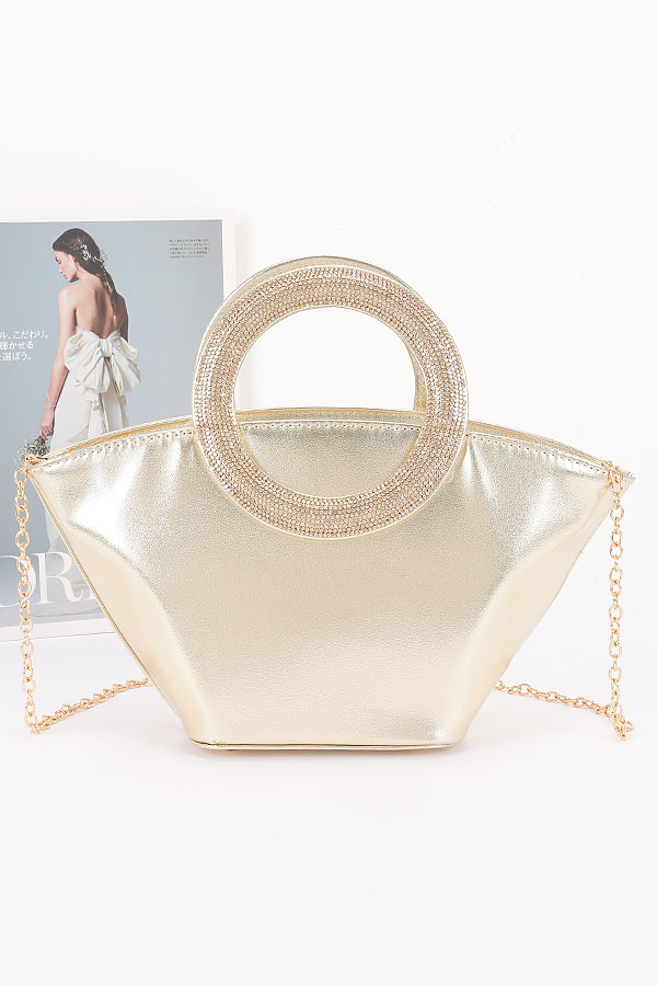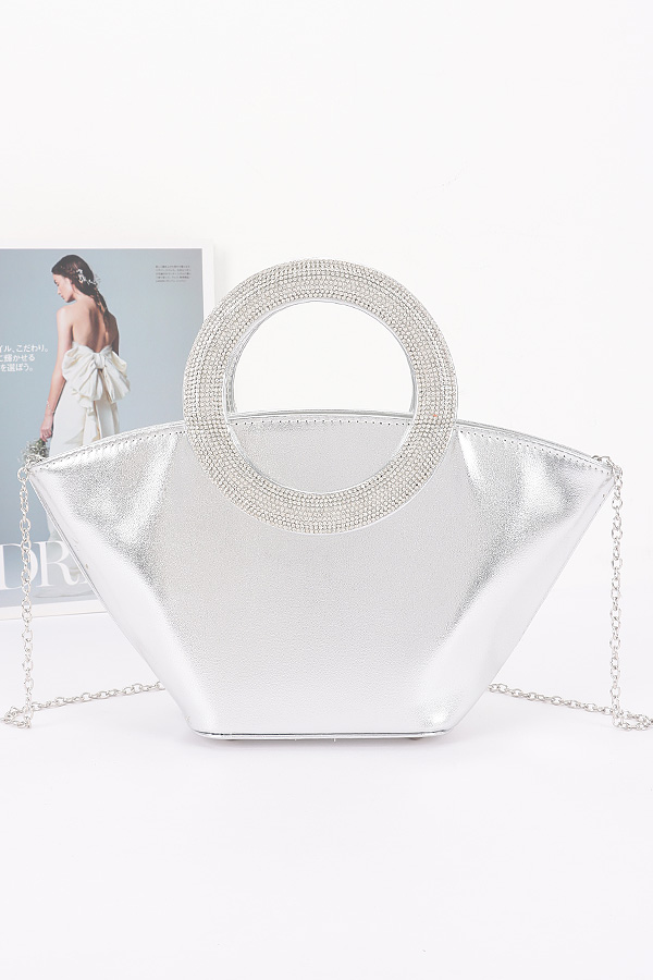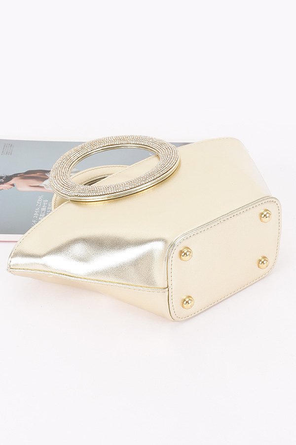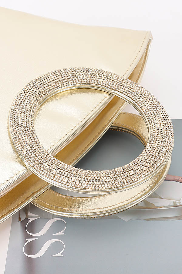 - * Metallic Faux Leather Rhinestone Handle Clutch