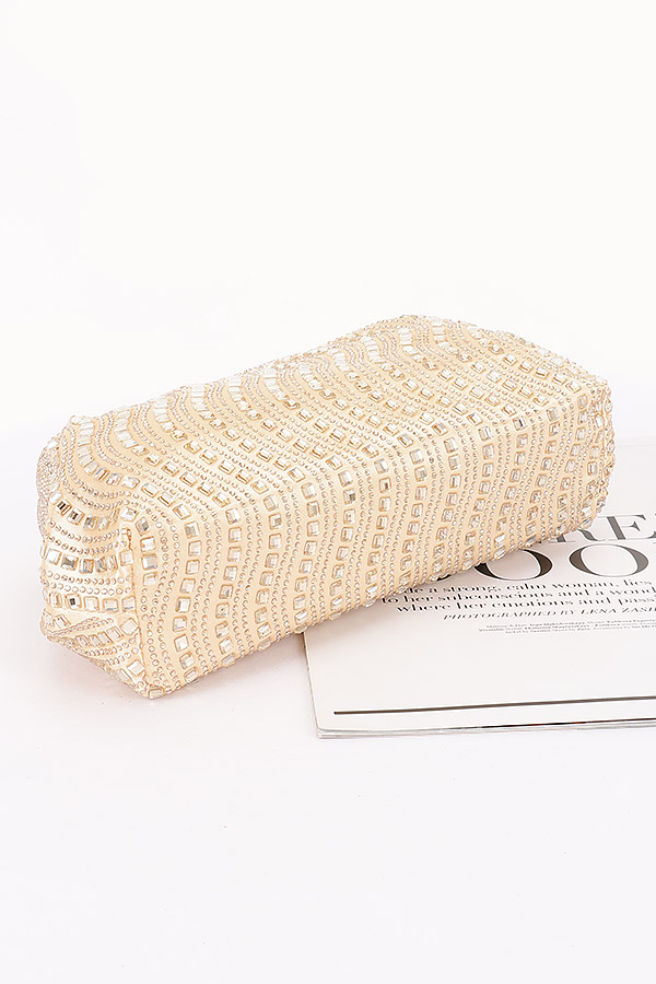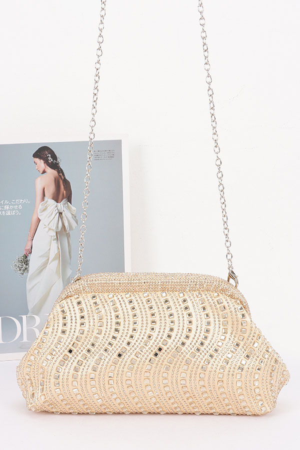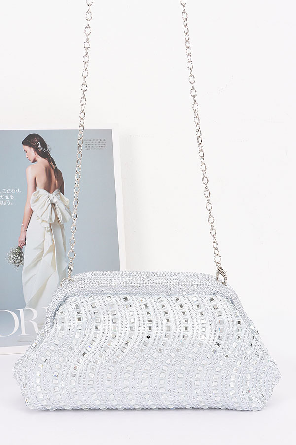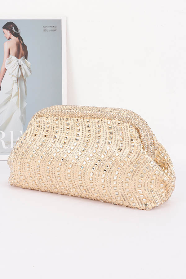 - * This is a Rhinestone Satin Clutch from H&D Accessories. Crafted with satin material, it features an intricate woven pattern of small rhinestones arranged in wavy lines, creating a shimmering and textured surface. The clutch has a curved silhouette with a magnetic snap closure and a detachable metal chain strap for versatile carrying options. Perfect for formal events, weddings, or evening parties to add an elegant and glamorous touch to your outfit.