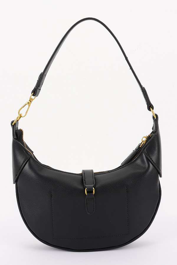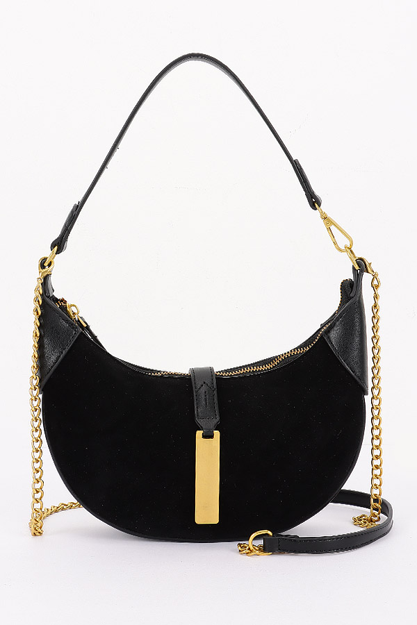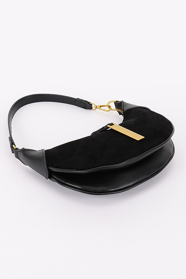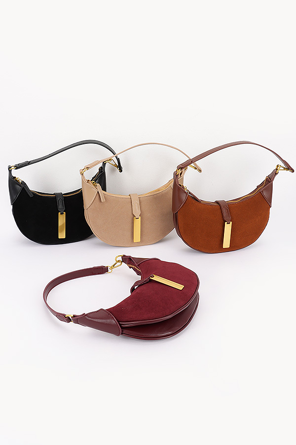 - * This is a Faux Suede Leather Hobo Bag from H&D Accessories. It features a crescent-shaped silhouette crafted from soft faux suede, accented with leather-like trim on the edges and handle connections. The front showcases a vertical leather strap with a rectangular gold-tone metal pendant. The top handle and detachable strap allow for versatile carrying. Perfect for adding a stylish flair to daily commutes, shopping trips, or dinner dates.