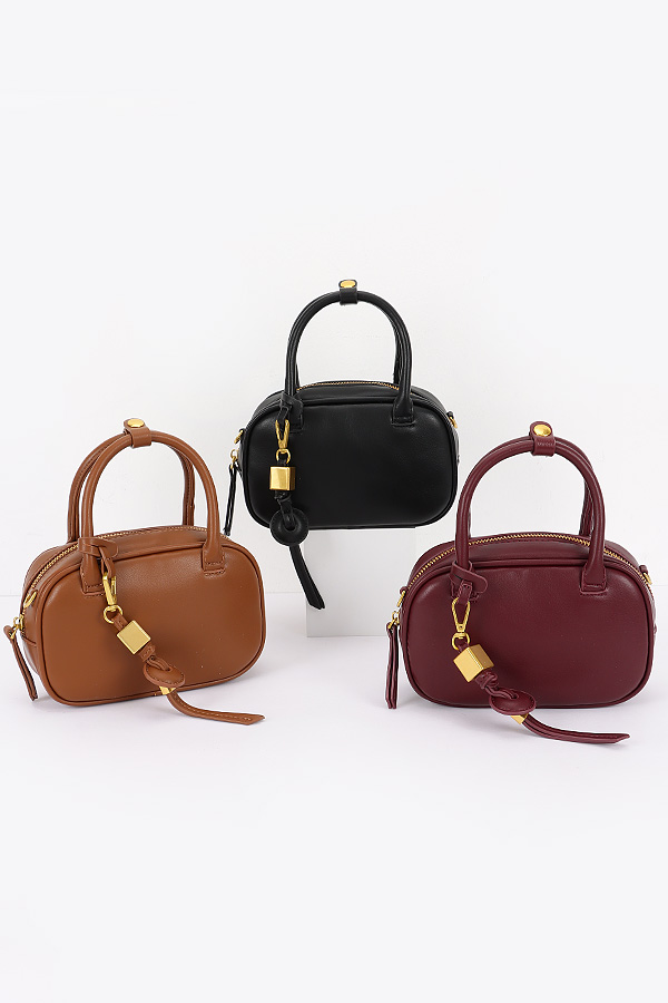 - * This is a Faux Leather Sport Bag from H&D Accessories. Crafted from smooth faux leather, it features a compact oval silhouette with clean stitching details. The top has a structured handle, while a detachable and adjustable shoulder strap with gold-tone hardware adds versatility. A small gold - colored lock charm hangs from the zipper pull, complemented by a leather tassel for a touch of style. The main compartment closes securely with a zipper, offering ample space for essentials. Perfect for gym sessions, outdoor workouts, or casual sports activities, combining functionality with a sleek, modern look.