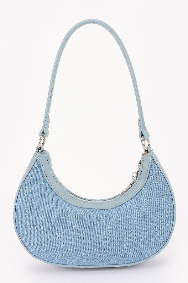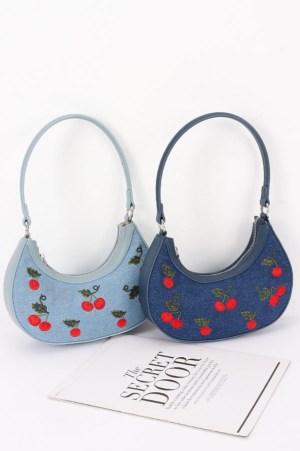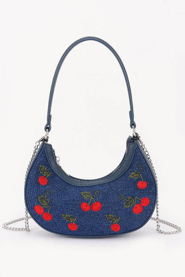 • * This is an Embroidery Cherry Denim Shoulder Bag from H&D Accessories. It has a stylish crescent shape and features delicate cherry embroidery all over. The bag comes with both a shoulder strap and a chain strap, offering versatile carrying options. When you're going for a casual day out with friends, strolling around the mall, or having a picnic in the park, this bag can be a perfect companion. It can hold your daily essentials like a wallet, keys, and a small notebook, while adding a touch of cute and trendy flair to your look.