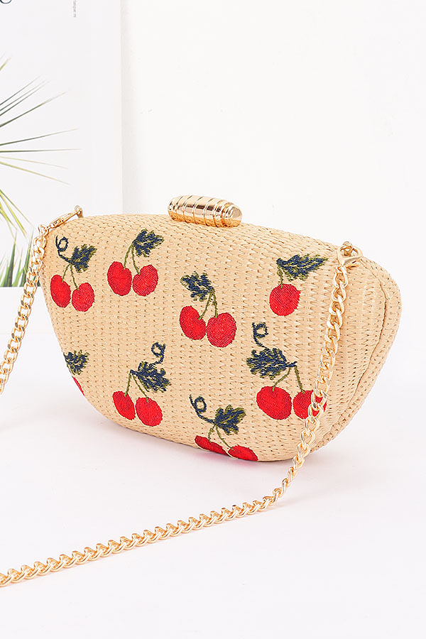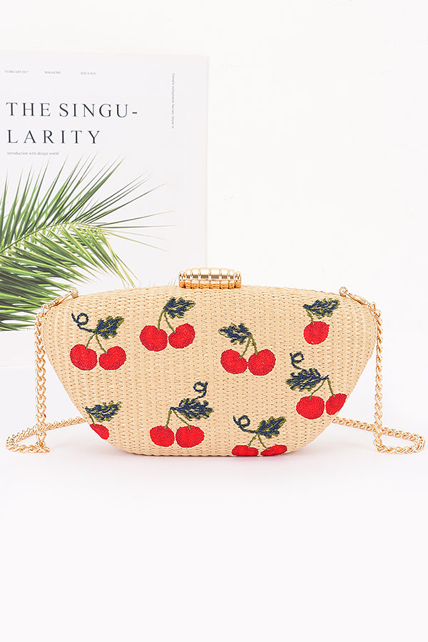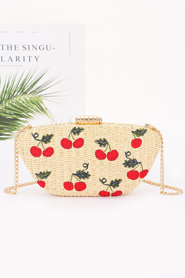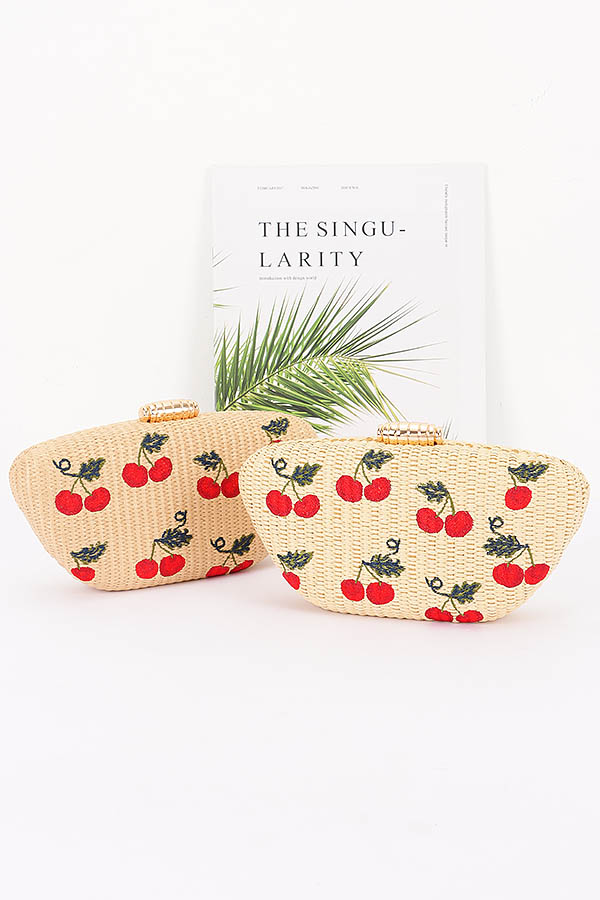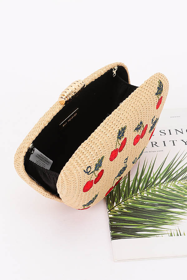 - * Embroidery Cherry Faux Straw Clutch Bag