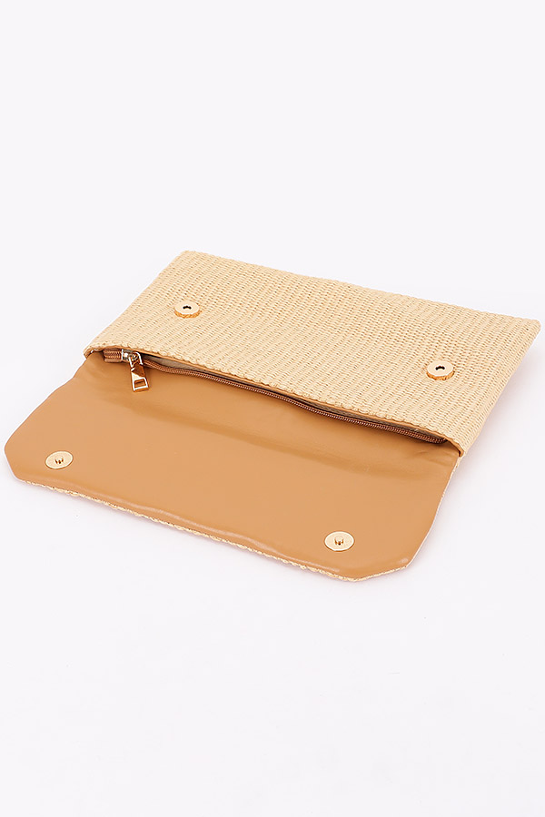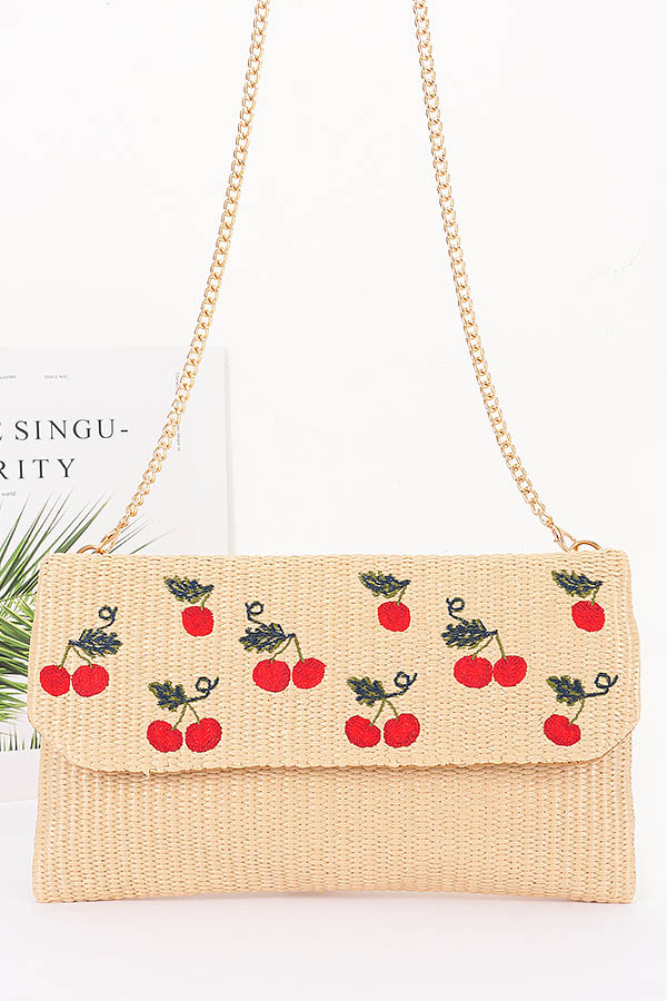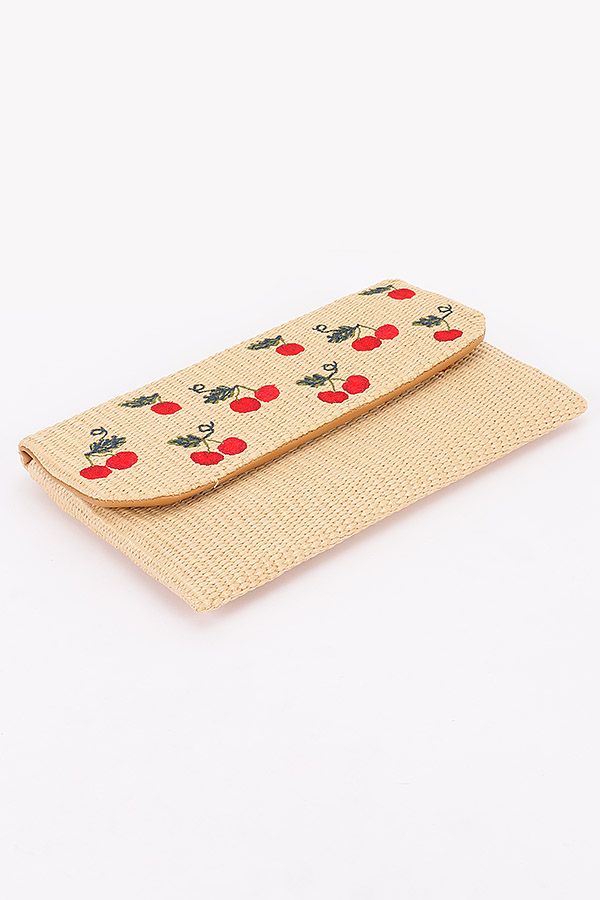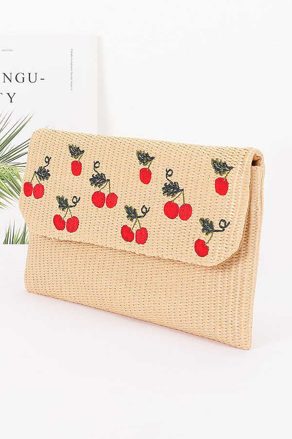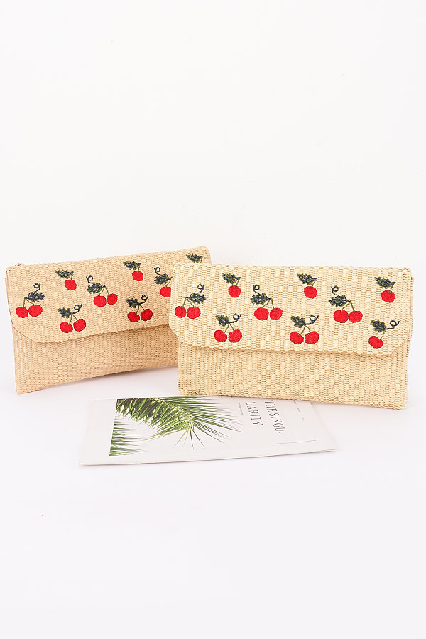 - * Embroidery Cherry Faux Straw Clutch Bag