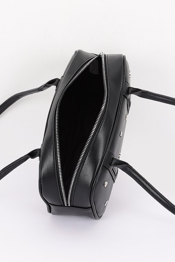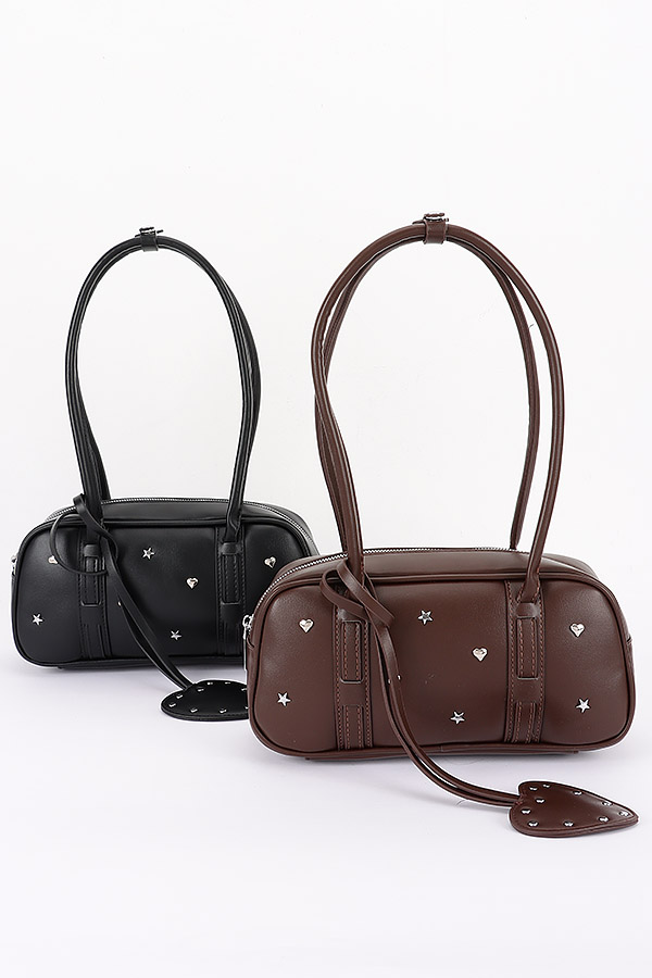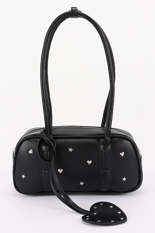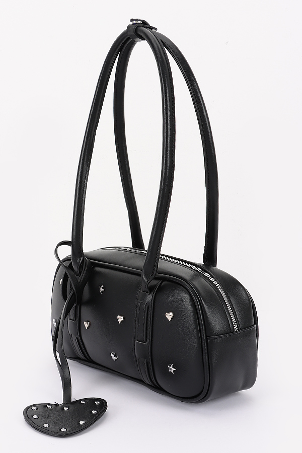- * Vegan Leather Metal Studded Boston Bag from H&D Accessories features a structured silhouette with dual top handles for easy handheld carrying. It is adorned with metal studs in heart and star shapes, plus a detachable heart - shaped leather charm with matching stud details, adding a playful yet edgy vibe. The main compartment secures with a top zipper closure, offering ample space for essentials. Ideal for daily errands, casual hangouts, or adding a stylish touch to your outfit, this bag blends functionality with trendy detailing.