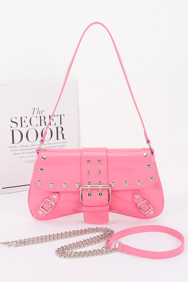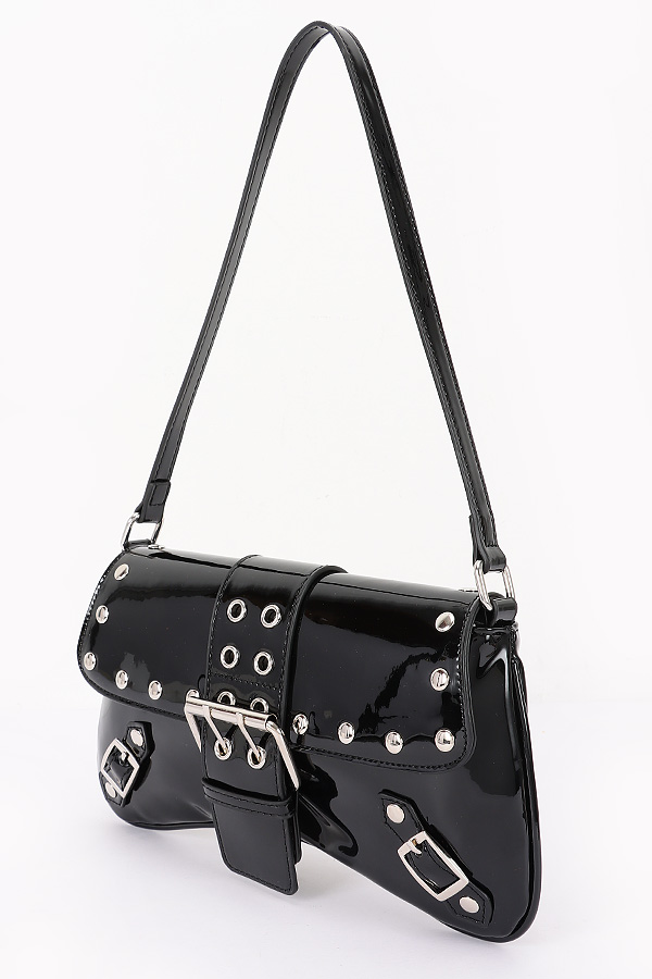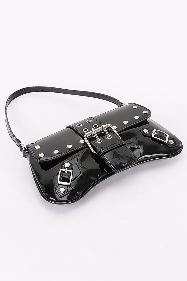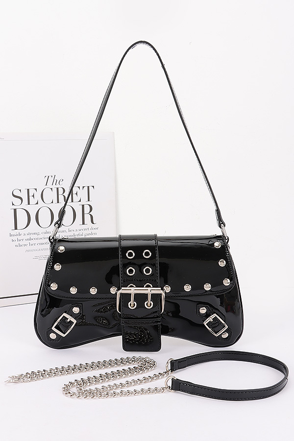 - * This Patent Vegan Leather Studded Baguette Bag from H&D Accessories features a sleek baguette shape with stud embellishments, a buckle closure, and convertible straps. It has an edgy and stylish appearance, giving off a bold and fashionable vibe.Ideal for accessorizing outfits during nights out, such as at concerts, clubs, or theater visits, adding a touch of edgy style.