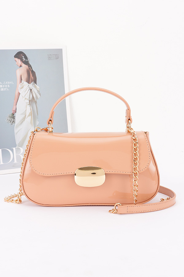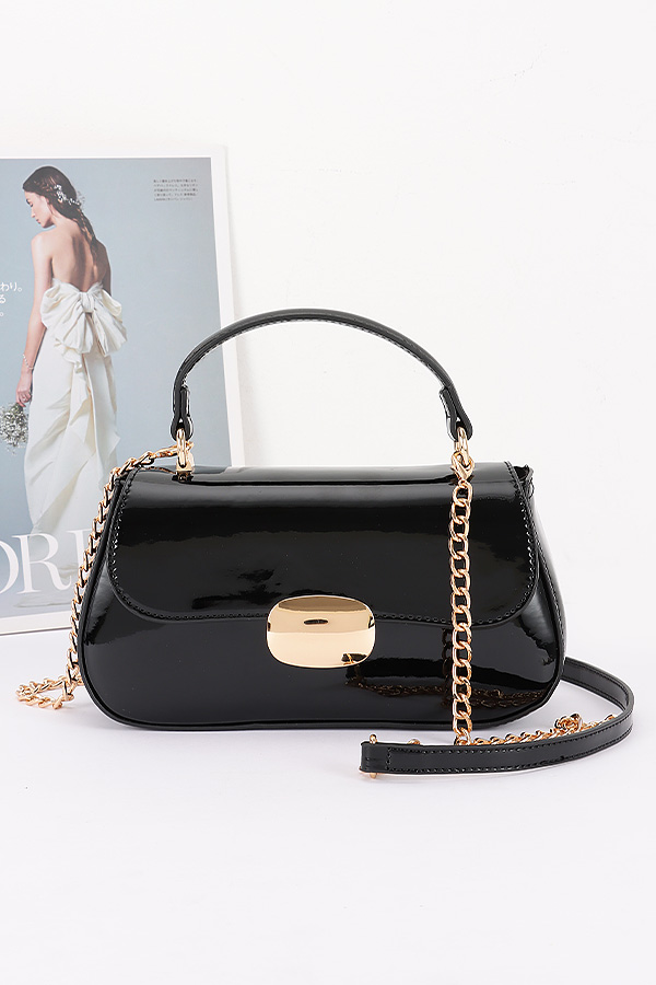 - * This is a Patent Faux leather Top Handle Bag from H&D Accessories. It features a sleek design with a prominent metallic clasp detail at the front, adding a touch of elegance. The bag comes with a top handle for easy carrying by hand and a detachable chain strap, allowing for versatile styling as a shoulder or crossbody bag. It's spacious enough to hold essentials like a phone, wallet, keys, and a small makeup pouch. You can take it with you when going for a casual lunch with friends, attending a small business meeting, or even a night out at the theater, as its chic appearance effortlessly complements various outfits and adds a refined touch to your look.