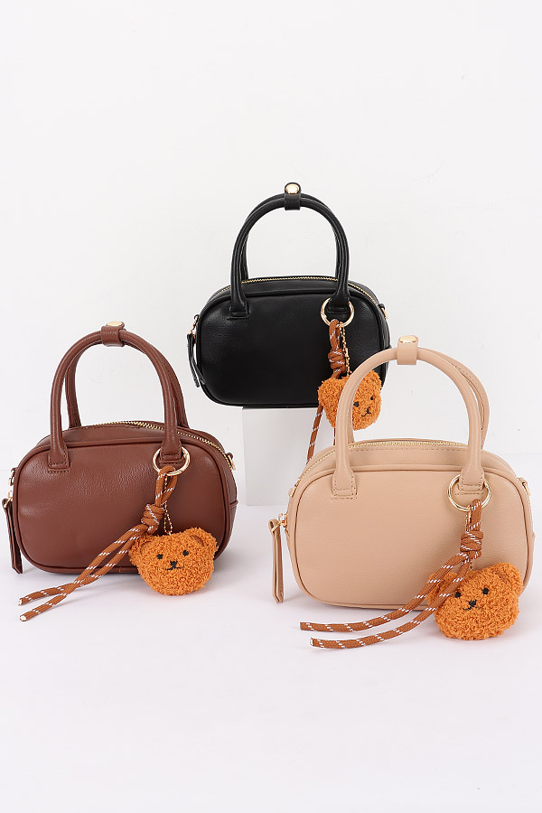 - * This Vegan Leather Mini Bowling Bag with Bear Charm from H&D Accessories features a compact bowling - bag shape in vegan leather, adorned with a cute bear charm and a strap. It has a playful and charming appearance, giving off a fun and stylish vibe.Ideal for adding a touch of playfulness to everyday outfits, whether going to work, meeting friends, or running errands.