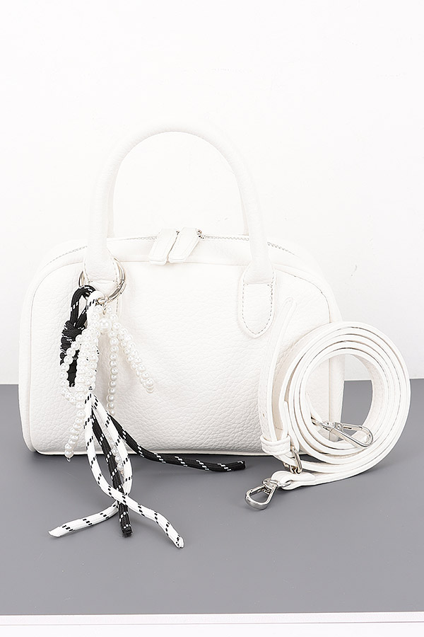• * This Vegan Leather Bowling Bag with Cute Charm from H&D Accessories features a classic bowling bag shape, a top handle, an adjustable strap, and a charming dangling bead and cord charm. It has a stylish and playful appearance, giving off a fun and fashionable vibe.Ideal for carrying essentials when going to work, meeting friends, or running errands, with its practical design and cute charm adding a touch of fun.