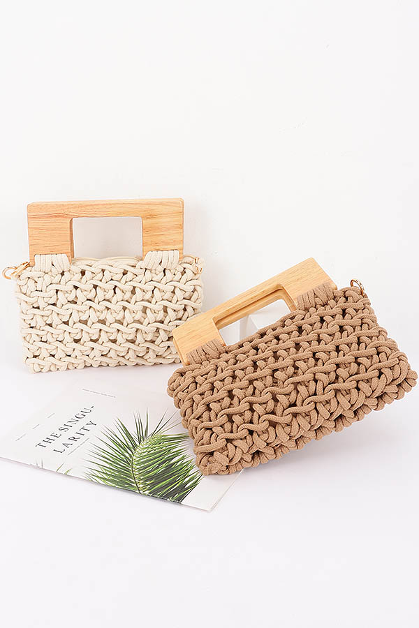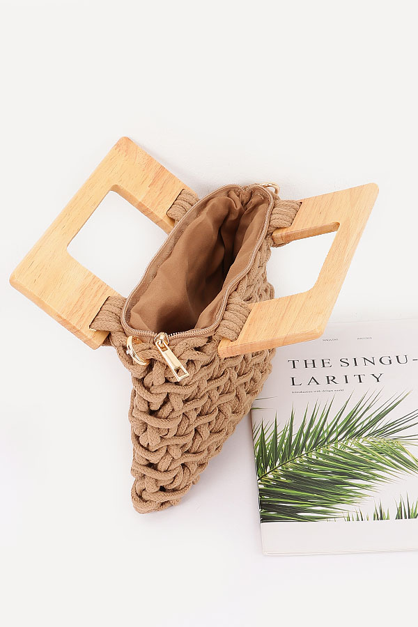 • * This Woven Bag with Wooden Handle from H&D Accessories features a textured woven design, a distinctive wooden handle, and an adjustable strap. It has a natural and stylish appearance, giving off a bohemian and chic vibe.Ideal for carrying essentials like sunscreen, a towel, and a book when heading to the beach, matching the relaxed seaside atmosphere.