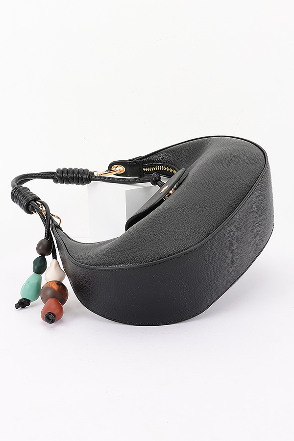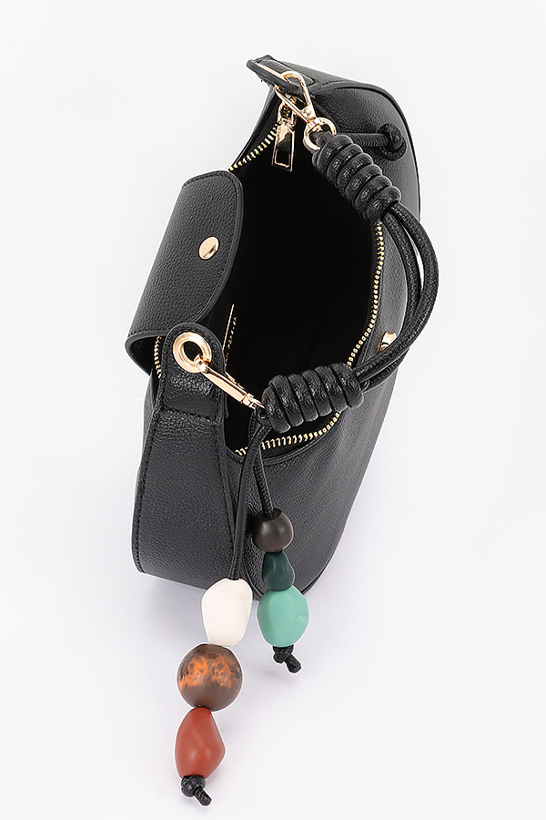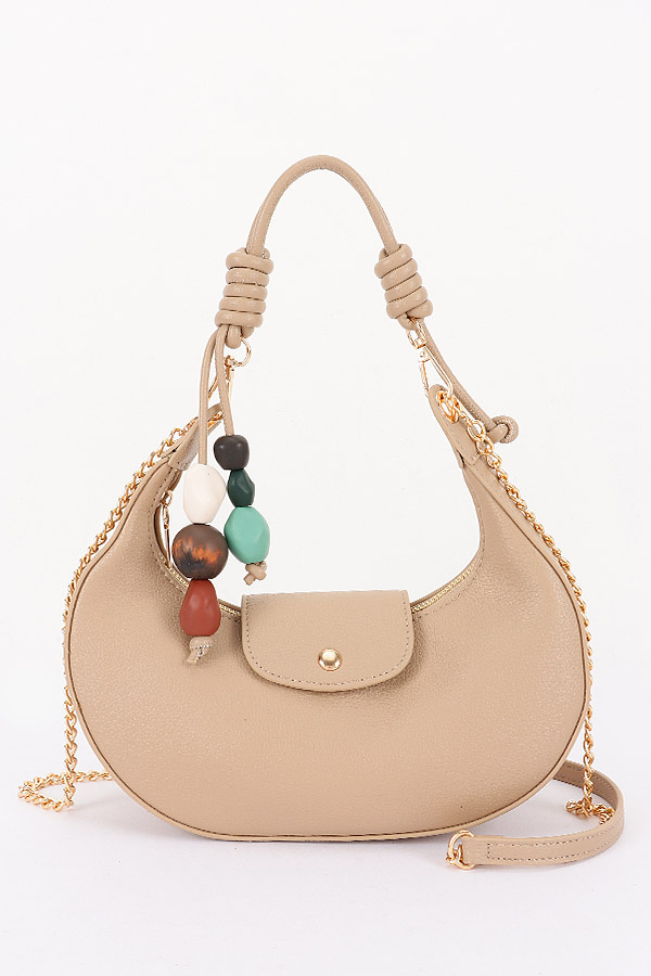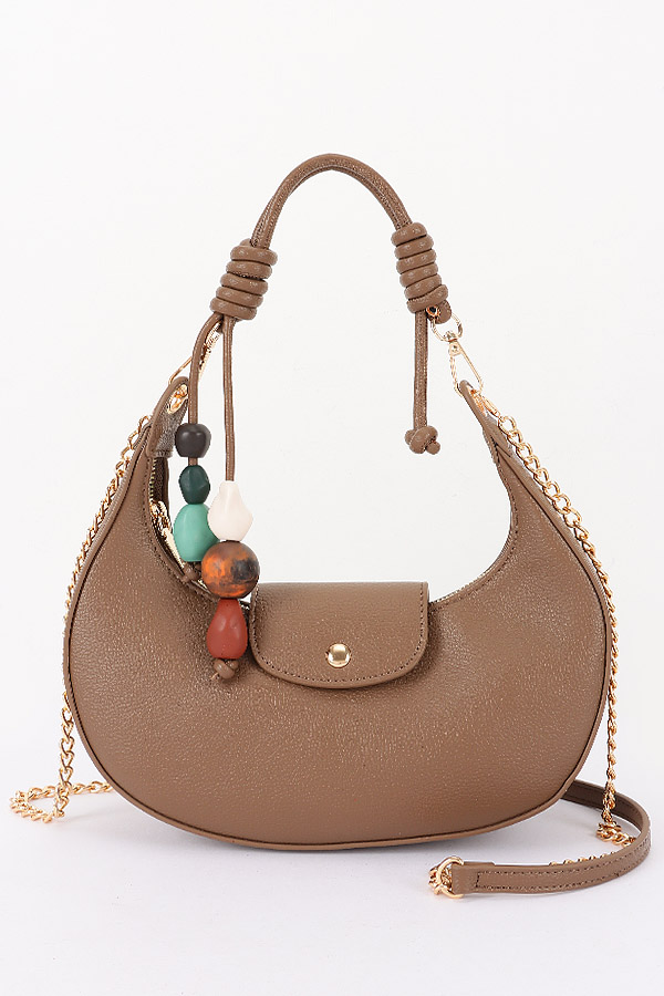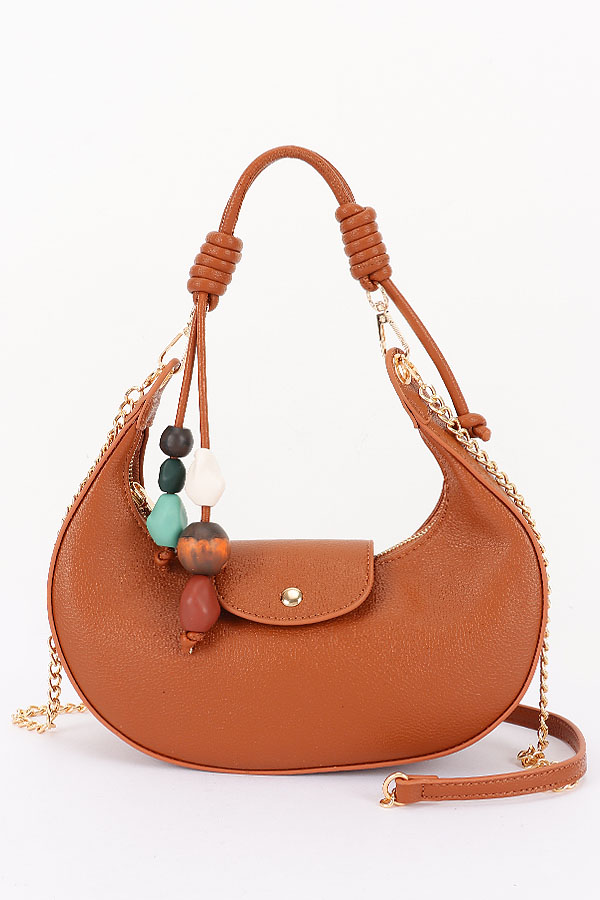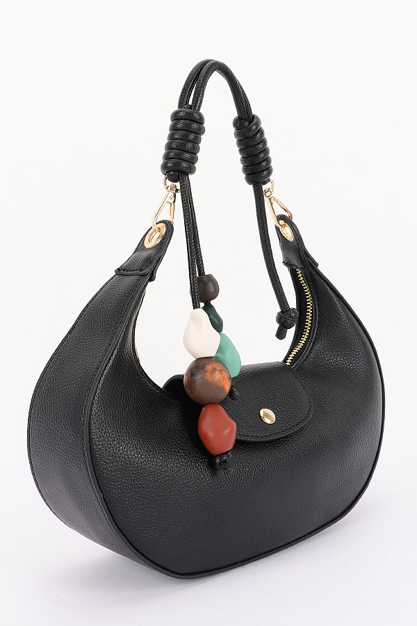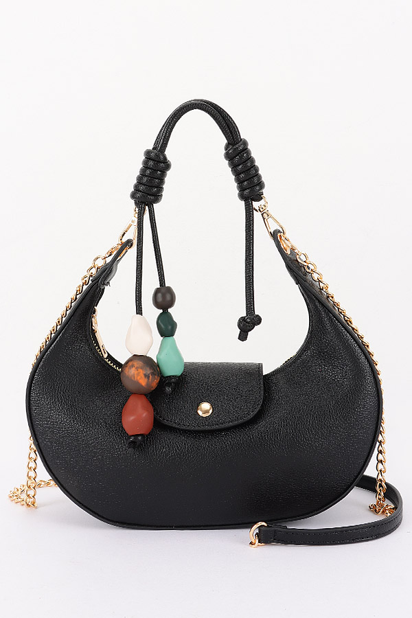 • * This is a stylish Vegan Leather Shoulder Bag w/ Charms from H&D Accessories. It features a sleek, curved silhouette, a small flap detail, and decorative beaded charms for a playful touch. The bag comes with both a top handle and a chain-accented shoulder strap, making it versatile for daily outings—perfect for pairing with casual outfits or evening looks when you need to carry essentials. Lightweight and chic, it balances functionality with on-trend design.