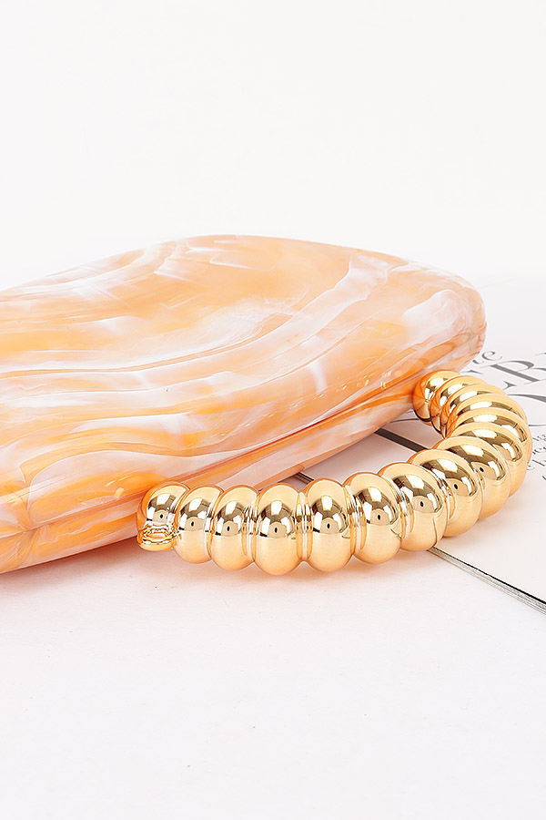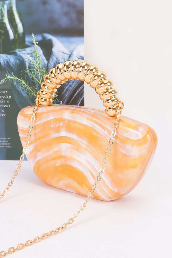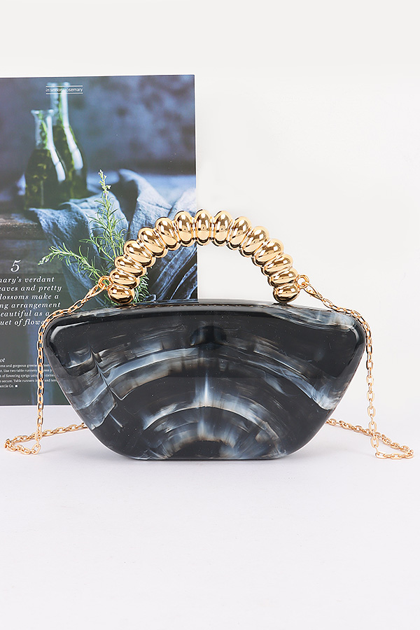 - * This Acrylic Marble Party Clutch from H&D Accessories features a sleek, curved acrylic body with a marble pattern, paired with a textured handle and a chain strap. It has a glamorous, artistic appearance, giving off a distinctive and eye-catching vibe.Ideal for carrying small essentials like lipsticks and cards at cocktail parties, proms, or holiday gatherings, serving as a standout decorative piece.