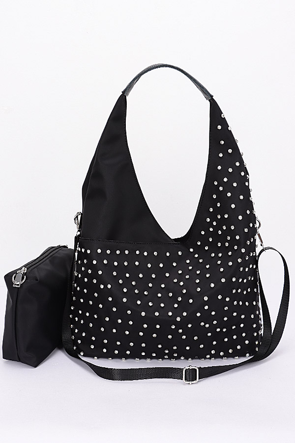- * Discover the "Rhinestone Studded Bindle Bag" from H&D Accessories – featuring a stylish bag alongside a matching purse. This bag adorned with rhinestone studs, this collection is the perfect blend of elegance and fun, making it a must-have accessory for fashion-forward individuals