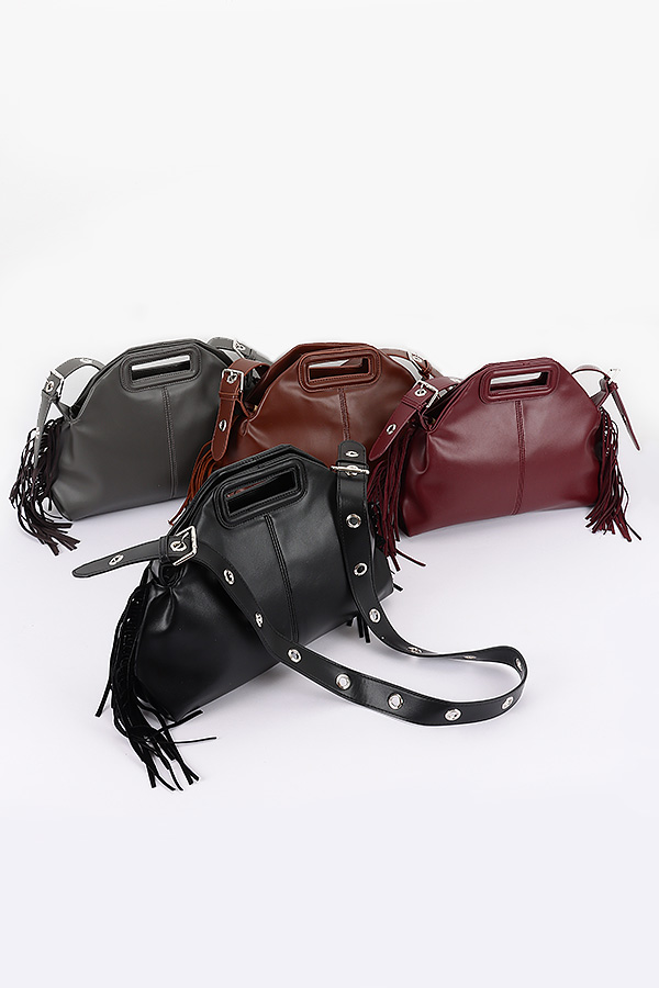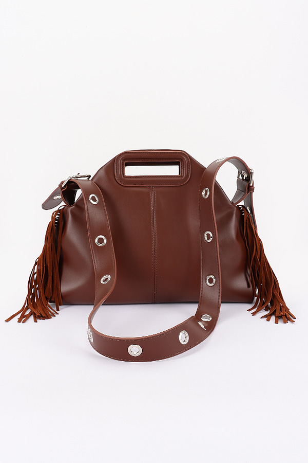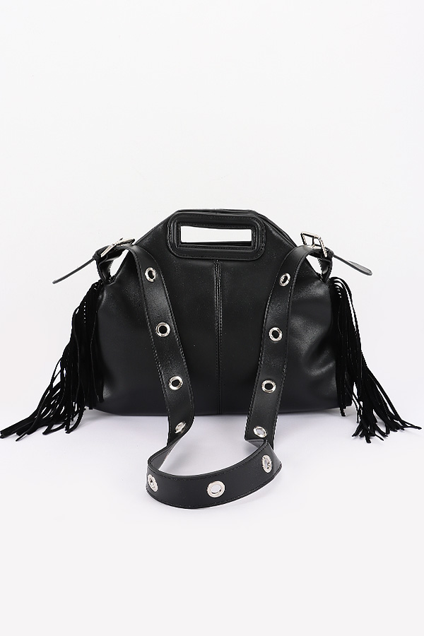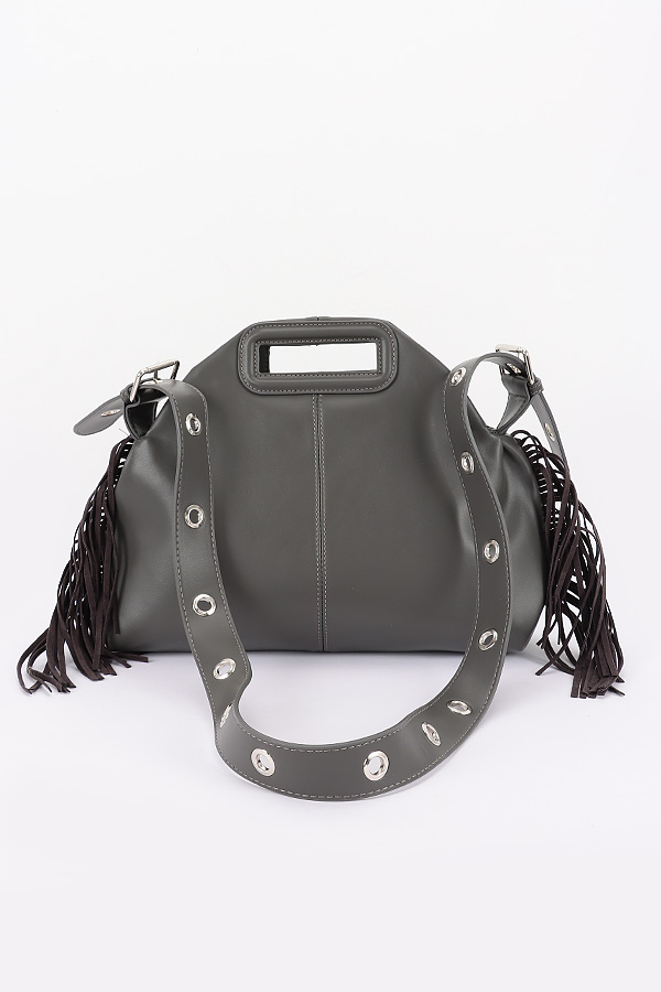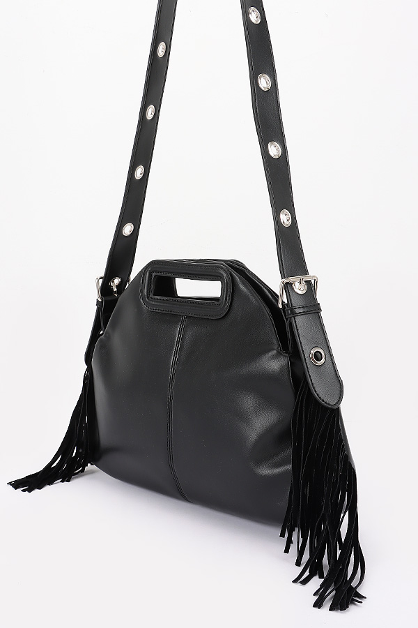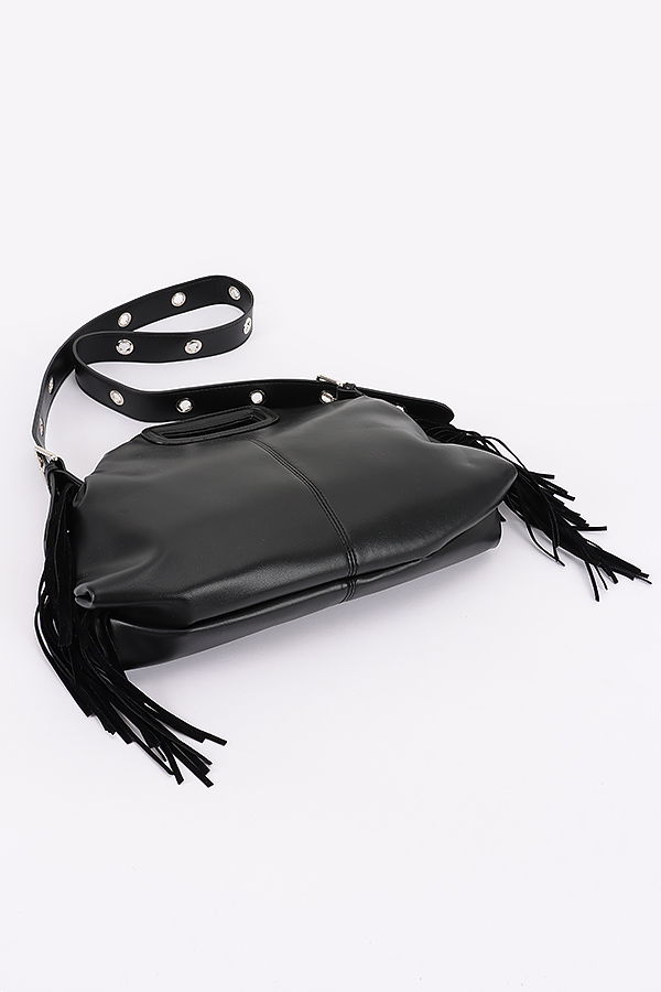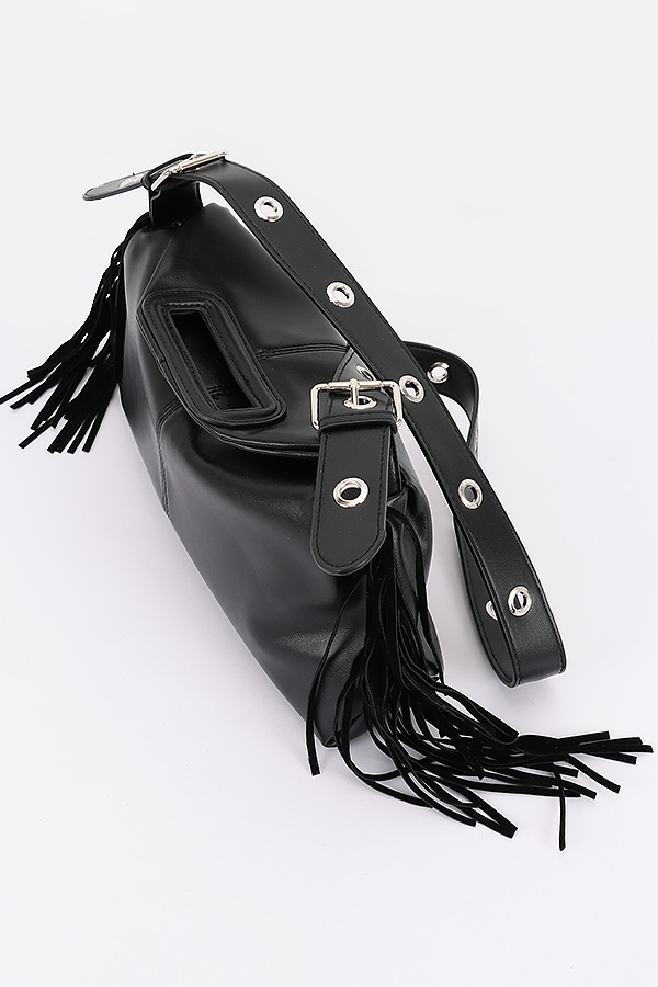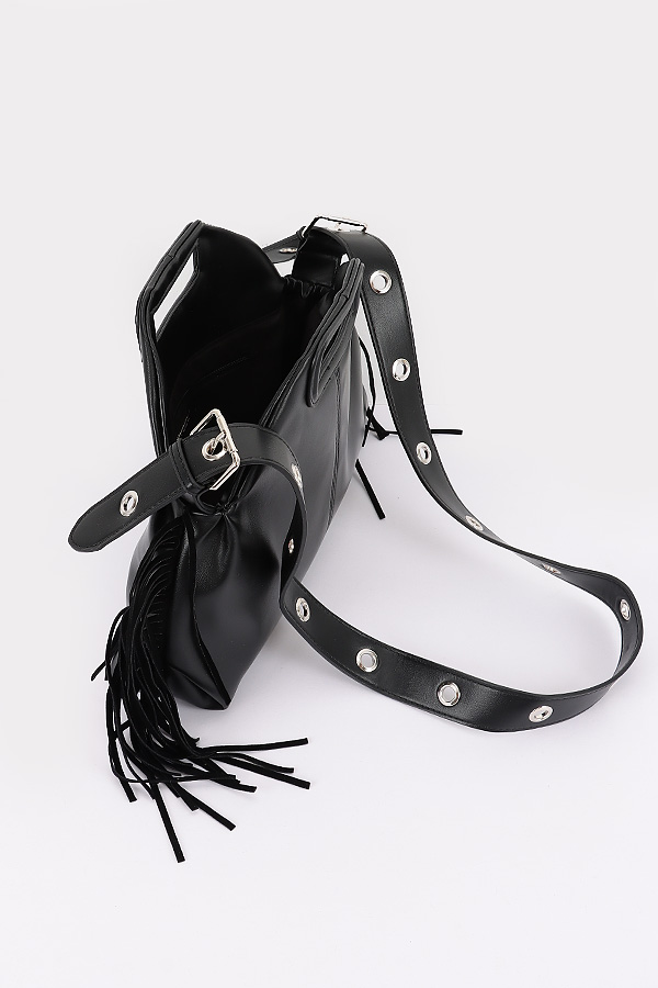- * This Fringe Trimmed Leather Bag from H&D Accessories features a structured silhouette with long fringe details on the sides. It has a top handle, plus a detachable, eyelet - adorned shoulder strap, blending edgy and chic elements.