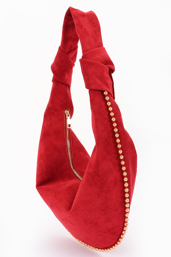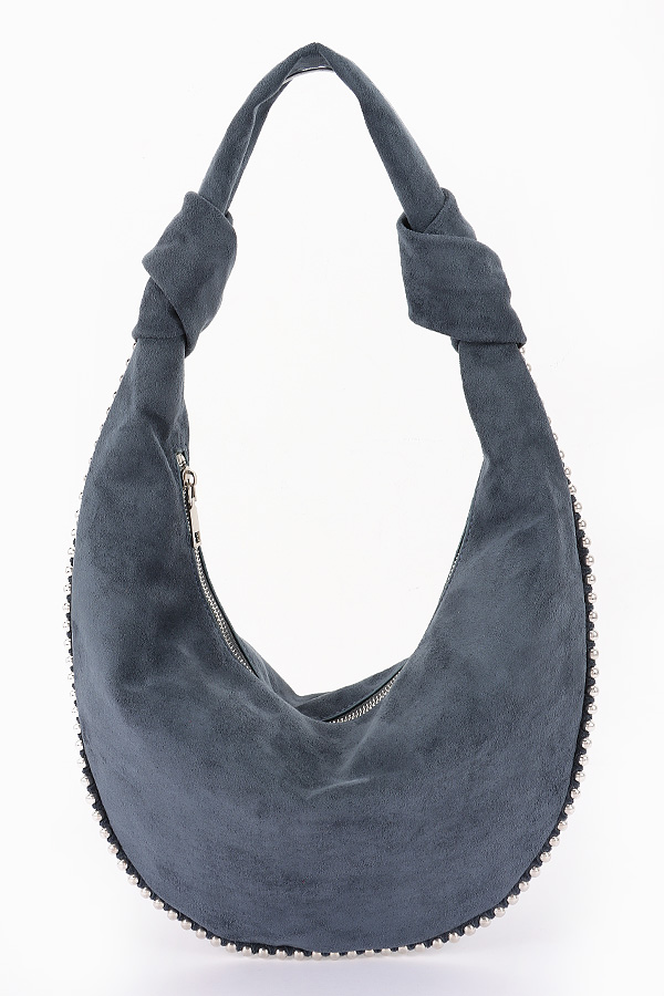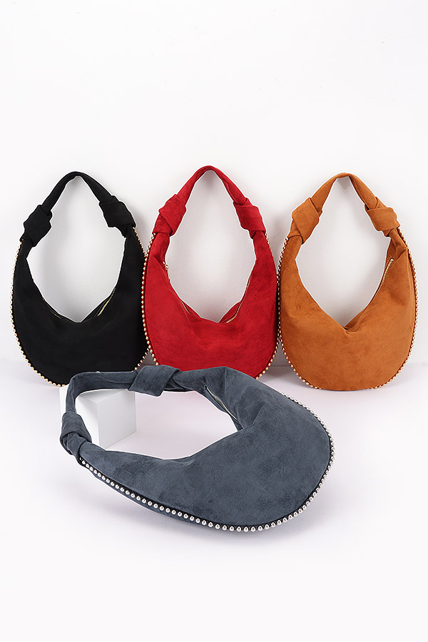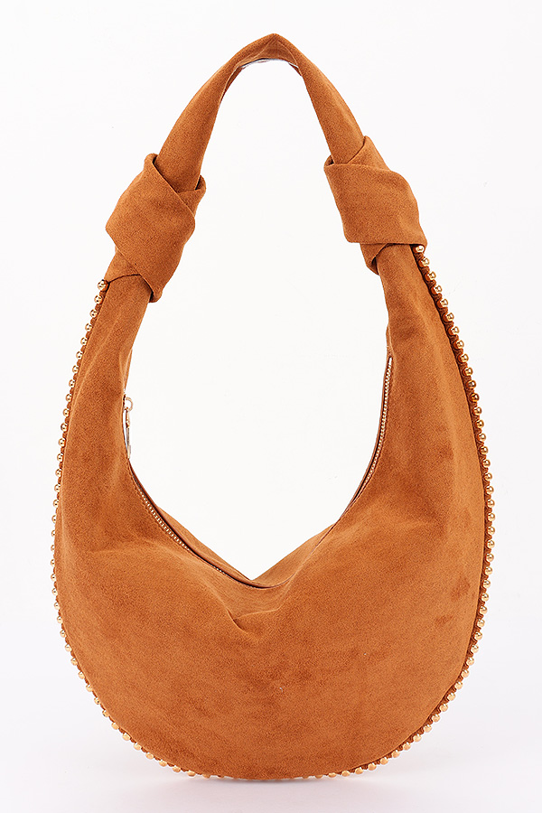 - * This is a Vegan Suede Metal Ball Hobo Bag from H&D Accessories. It has a stylish, curved silhouette with a unique knot detail on the top handle, adding a touch of fashion. The bag is adorned with metal ball embellishments along the edges, giving it an elegant and distinctive look. It comes with a spacious interior, perfect for holding daily essentials like a wallet, phone, keys. You can carry it when going for a casual shopping trip in the city, meeting friends for a coffee at a cozy cafe, or attending a relaxed weekend gathering. Its chic design allows it to effortlessly complement various outfits, adding a trendy charm to your look.
