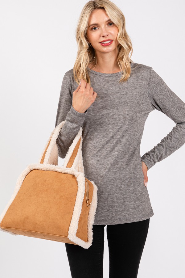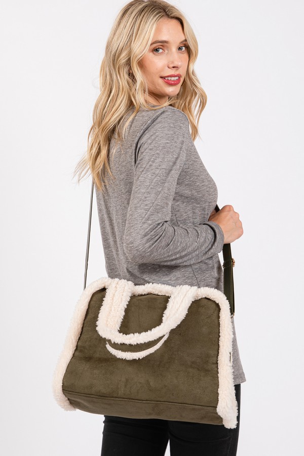- * Fleece Trimmed Solid Tote And Crossbody Bag With Adjustable Strap
