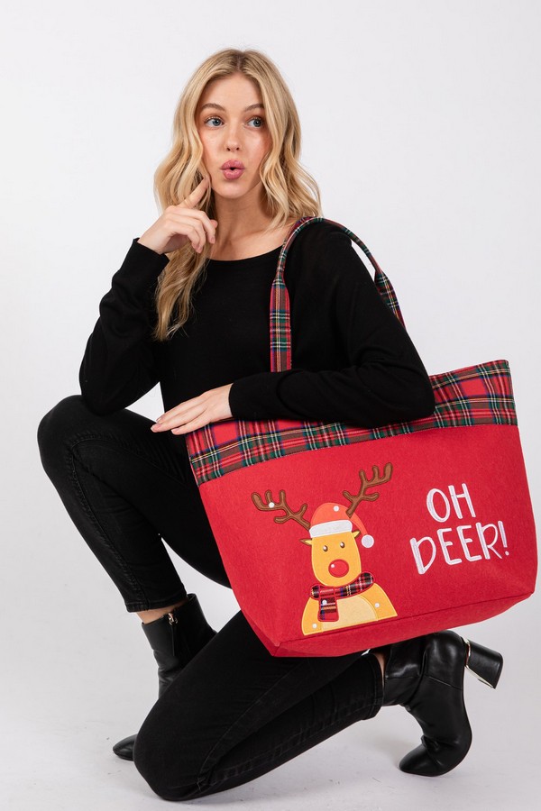 - * Introducing the "Oh Deer Letter Reindeer Christmas Tote Bag" – a festive and stylish accessory that perfectly captures the spirit of the season. This eye-catching red tote bag, features a charming Reindeer design adorned with playful lettering, is not just a fashion statement, it's a delightful way to spread holiday cheer wherever you go. Elevate your Christmas shopping experience with this charming piece from H&D Accessories.