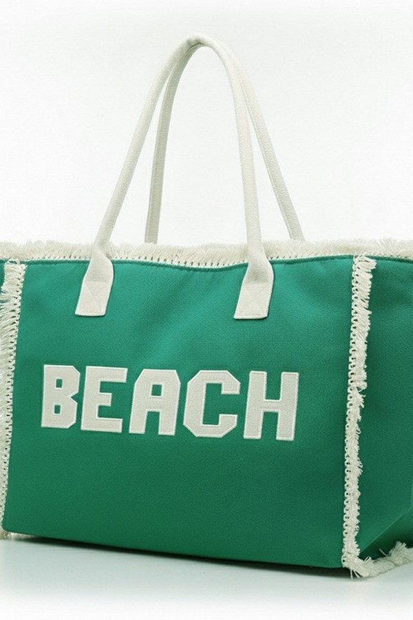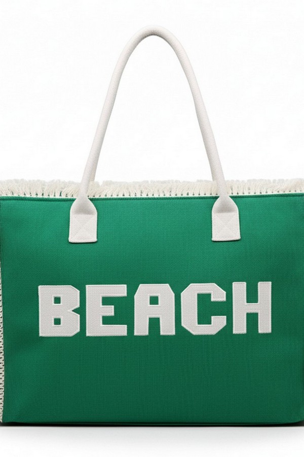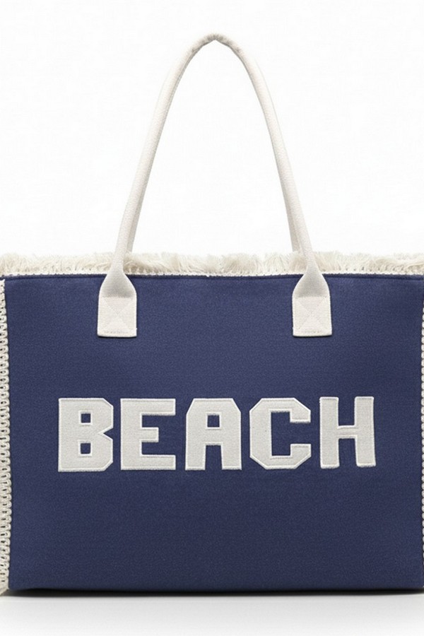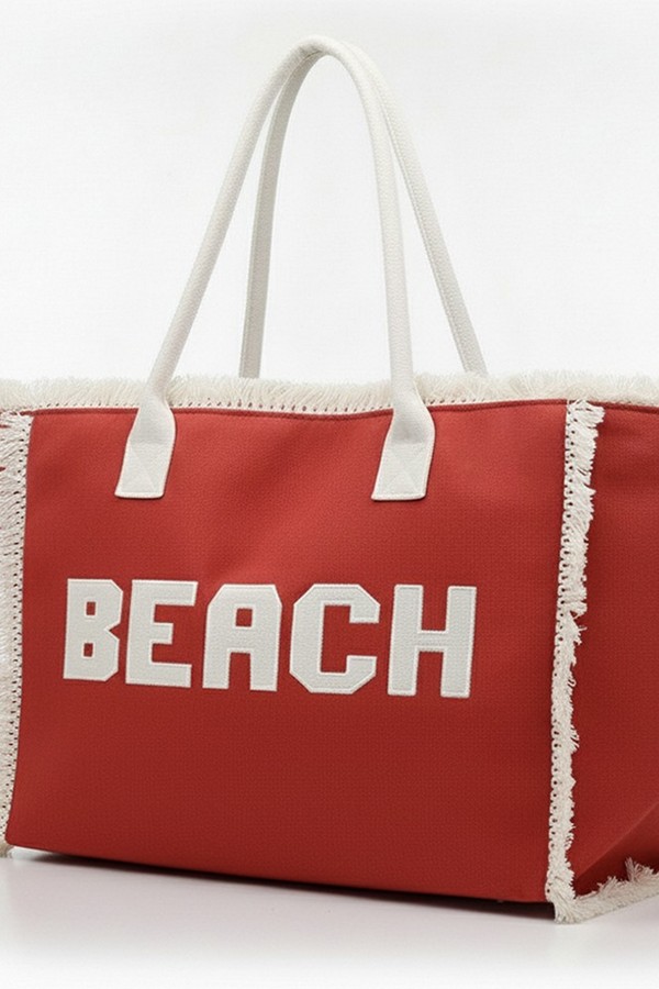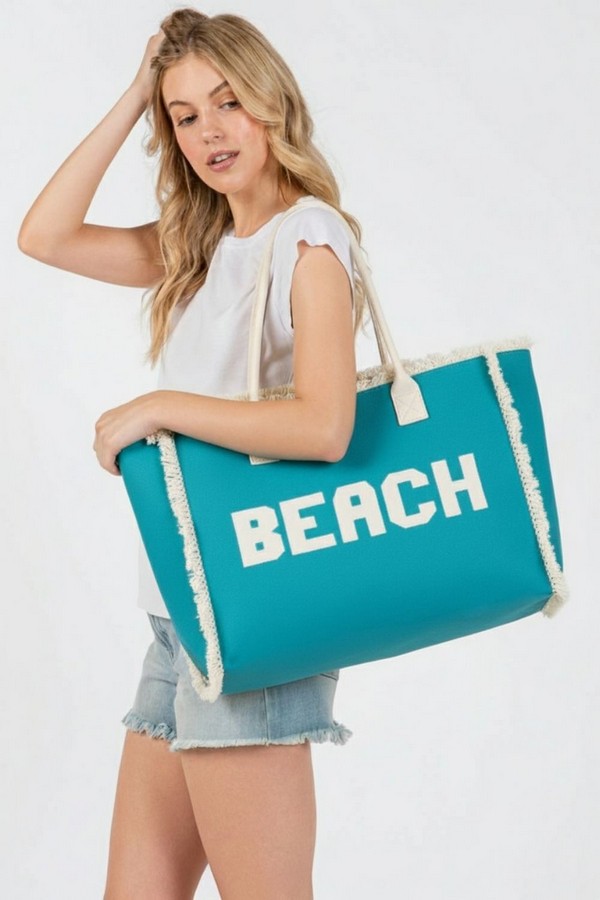 - * This is the Embroidered Beach Letter Fringe Tote Bag from H&D Accessories. It features prominent embroidered "BEACH" lettering and a fringe trim that adds a relaxed, summery touch to its design. It’s ideal for a day by the shore—you can easily stow items like a beach towel, sunscreen, a hat, and a book inside, while its roomy structure and casual style also make it suitable for casual outings like boardwalk strolls or post-beach café visits, fitting seamlessly into laid-back warm-weather plans.