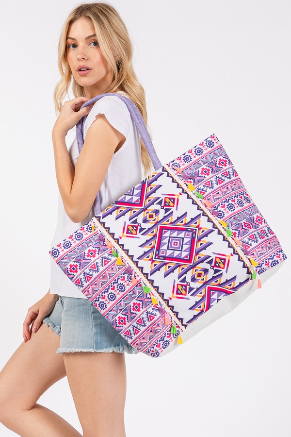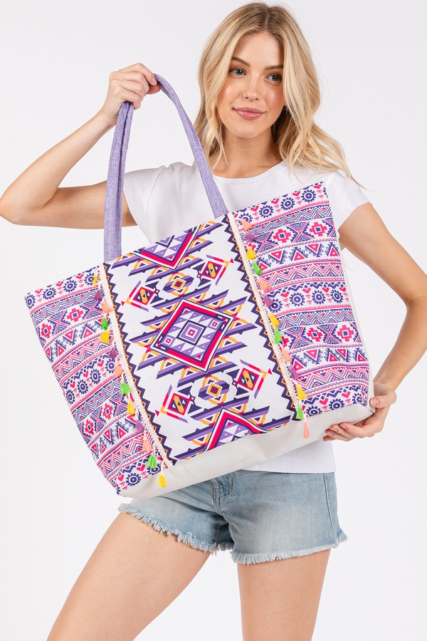 - * Introducing the "Boho Print Fringe Tote Bag" – a stunning blend of vibrant purple, playful pink, and crisp white. This tote bag from H&D Accessories is not just a fashion statement, it's a celebration of culture and style. Perfect for any occasion, it adds a touch of bohemian flair to your wardrobe while offering ample space for all your essentials.