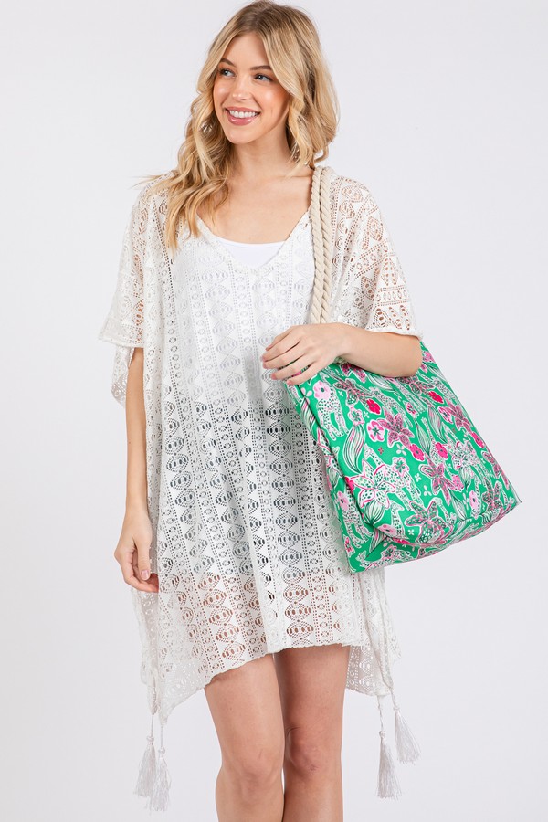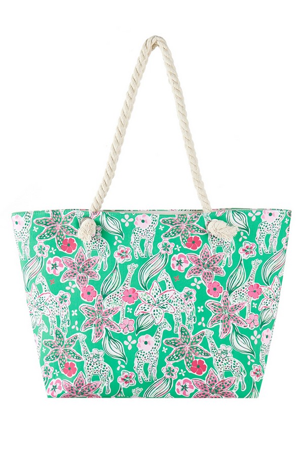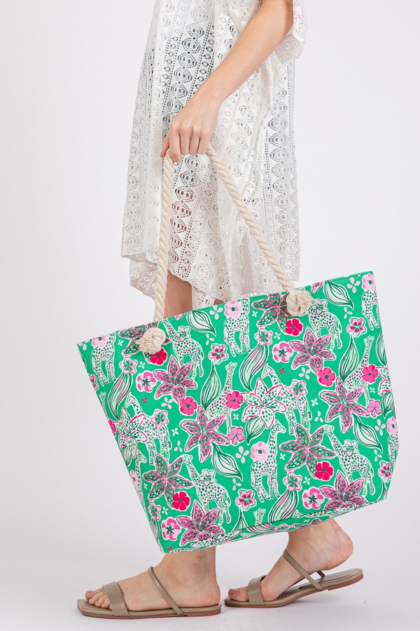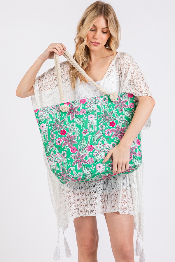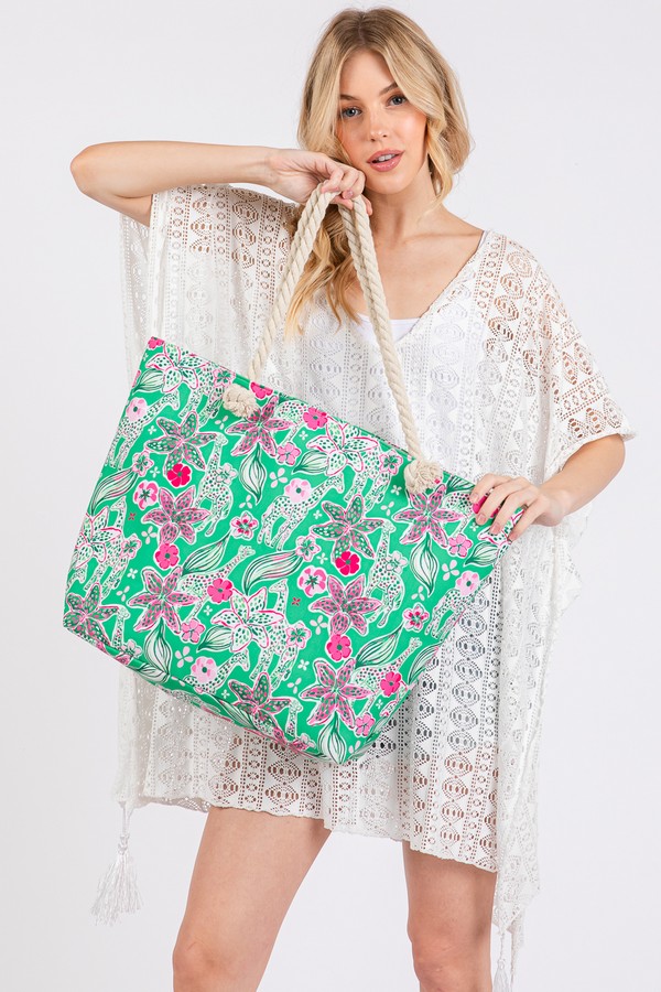 - * Introducing the "Flower Print Rope Strap Tote Bag" – a vibrant green bag adorned with stunning pink and white flowers, perfect for your beach adventures. With its stylish flower print and durable rope strap, this tote from H&D Accessories combines functionality with a touch of tropical elegance. Make a statement this summer!