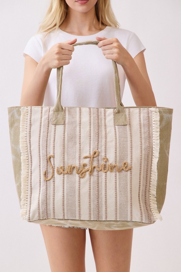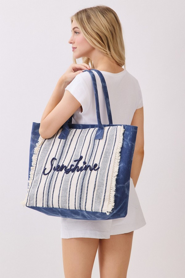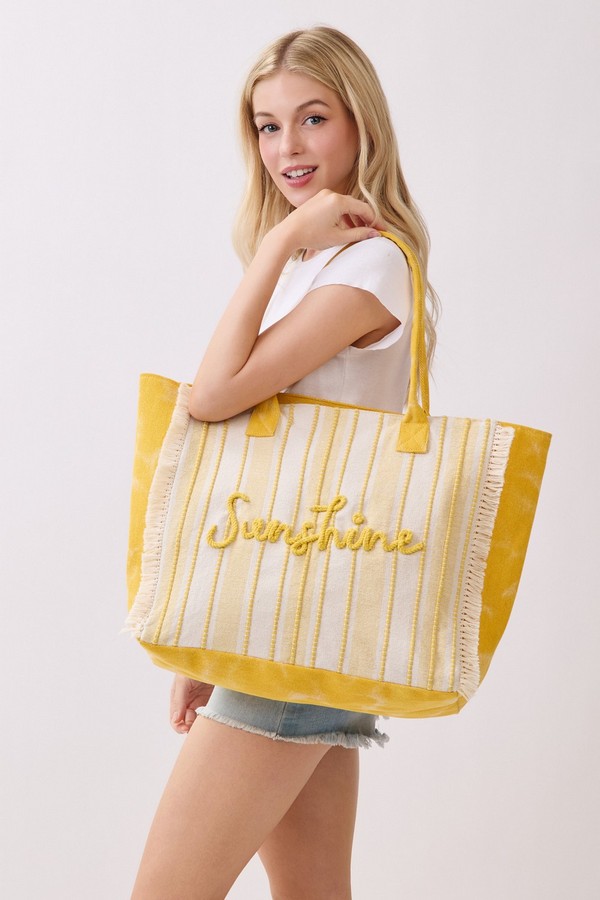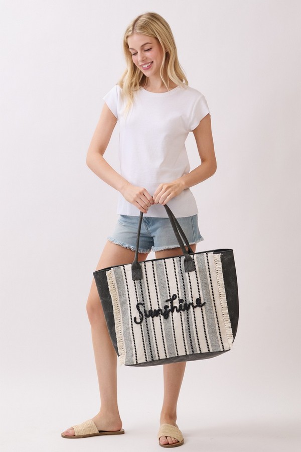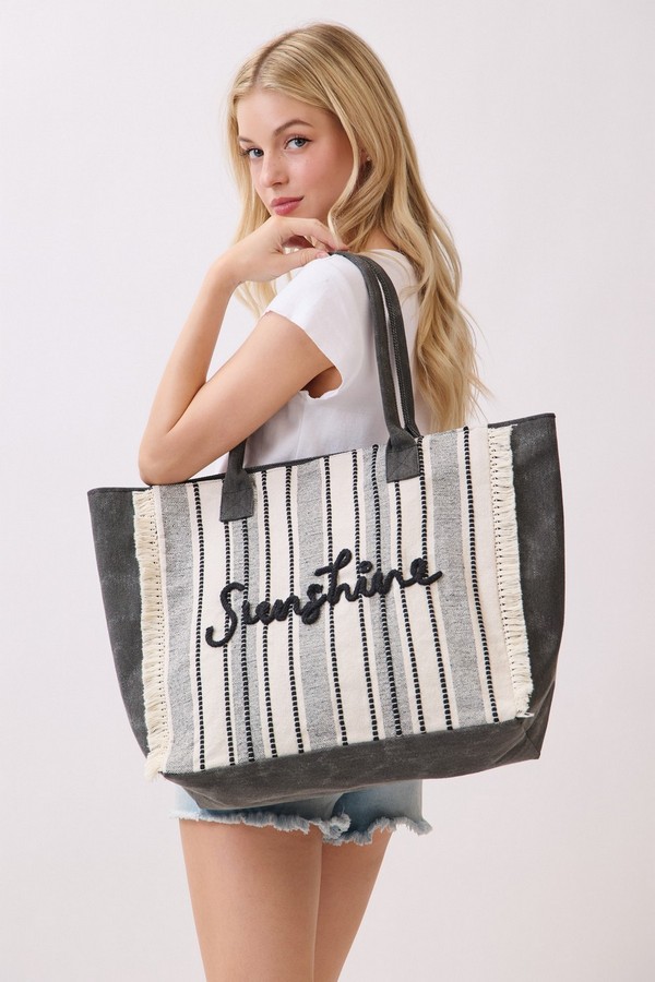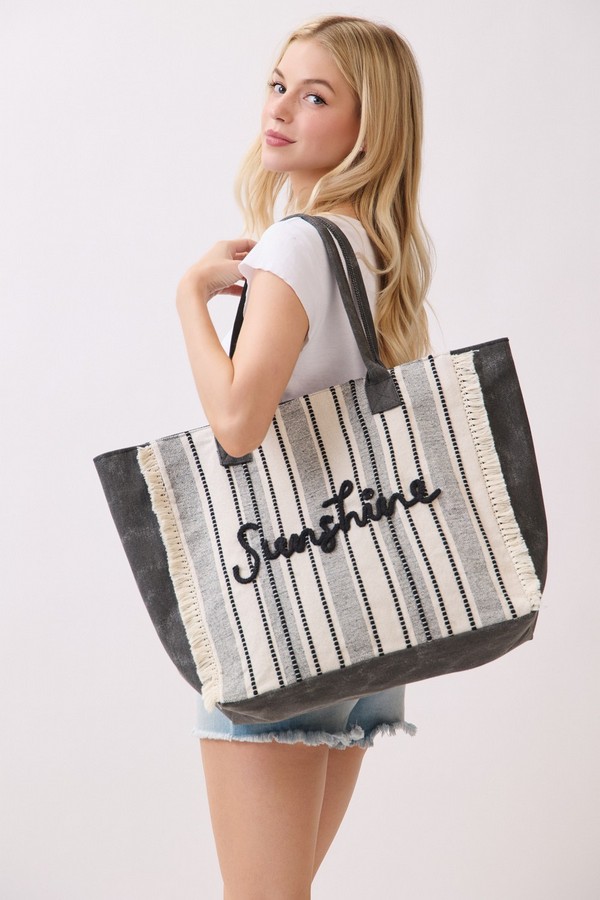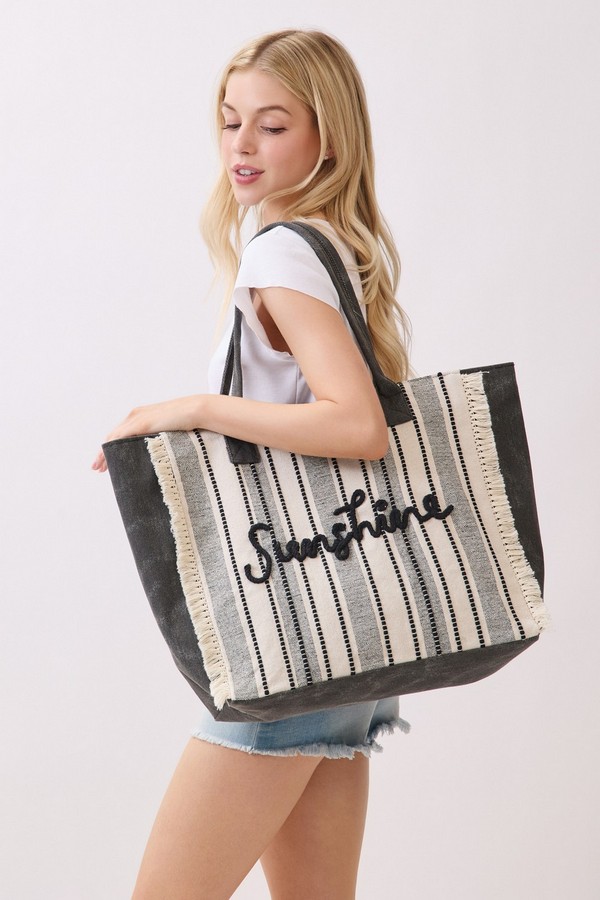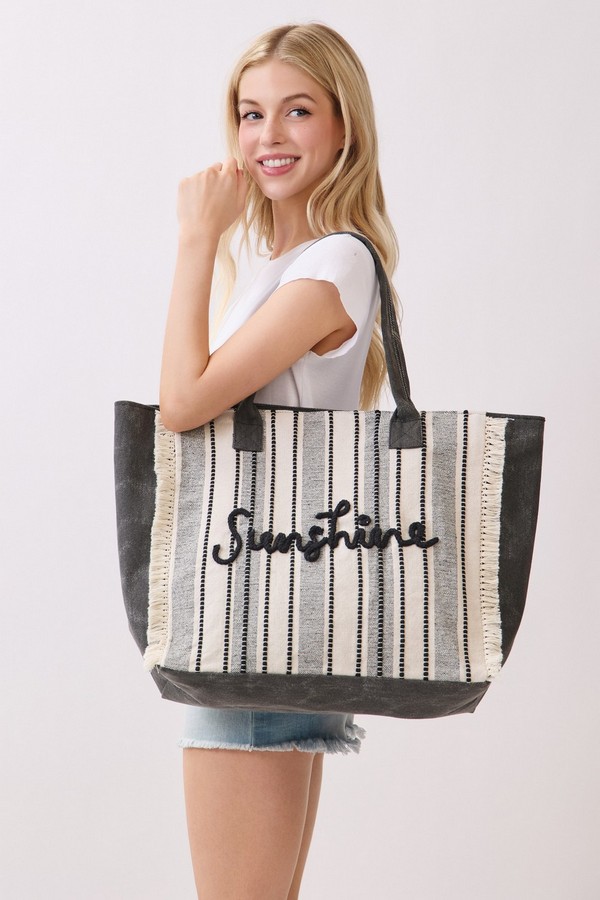 - * This is the Vintage Sunshine Stripe Fringe Tote Bag from H&D Accessories. It features striped detailing paired with a textured "Sunshine" embroidery and fringe trim, bringing a warm, nostalgic charm to its design. It’s perfect for a casual morning brunch with friends—you can stow a compact wallet, a pair of sunglasses, and a small notebook inside, while its roomy structure also works well for a leisurely park walk, letting you carry a light blanket and a snack with effortless, laid-back style that complements relaxed daily outfits.