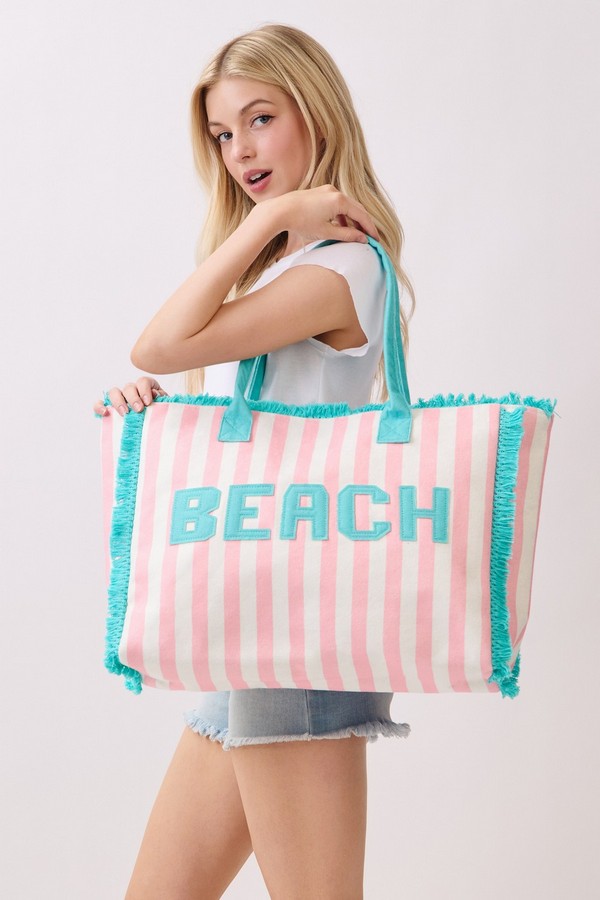 - * This Embroidered Beach Letter Terry Cloth Frayed Striped Tote Bag from H&D Accessories features a classic striped pattern, bold “BEACH” embroidery, and soft frayed trim, paired with sturdy handles for comfortable carrying. Its spacious interior easily holds your beach towel, sunscreen, sunglasses, and picnic essentials, making it a stylish and practical choice for a day by the sea, poolside relaxation, or casual weekend outings.