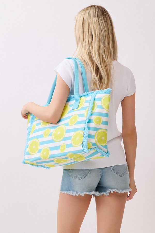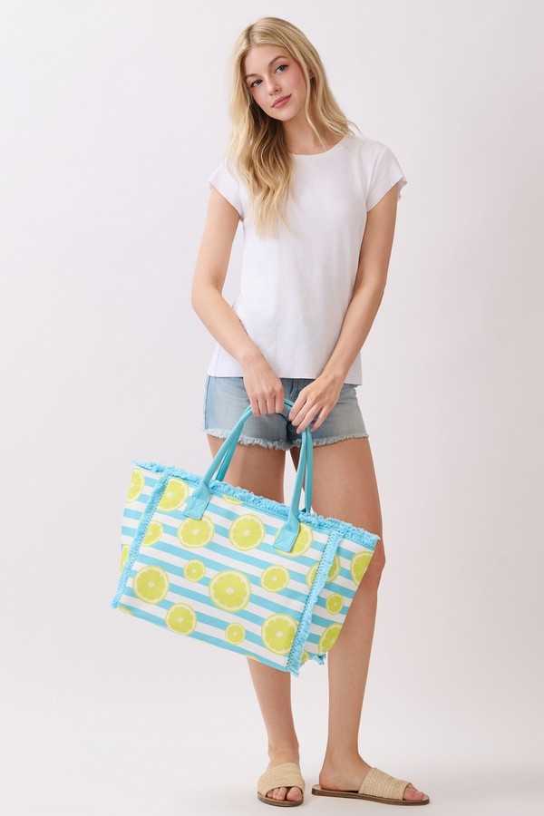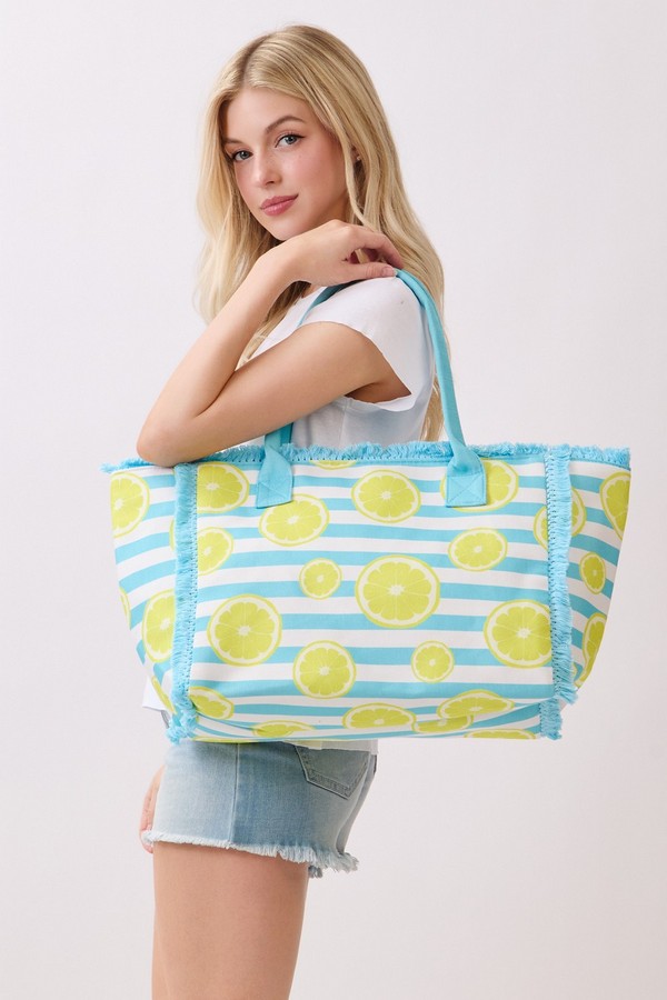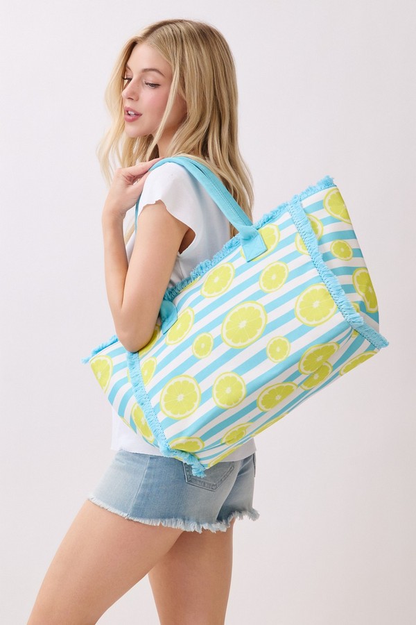 - * This Lemon Stripe Fringe Tote Bag from H&D Accessories features a fun fruit-inspired print set against a classic stripe base, finished with soft fringe trim and durable handles for easy carrying. Its roomy interior can comfortably fit your beach towel, snacks, and sunscreen, making it a cheerful and practical companion for picnics, pool days, or casual weekend shopping trips.