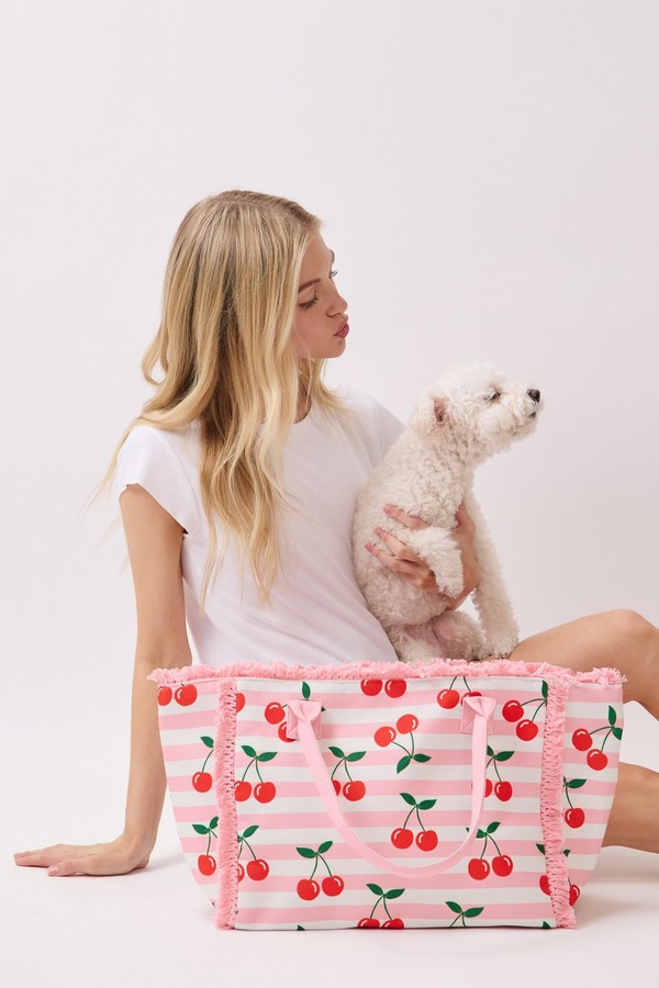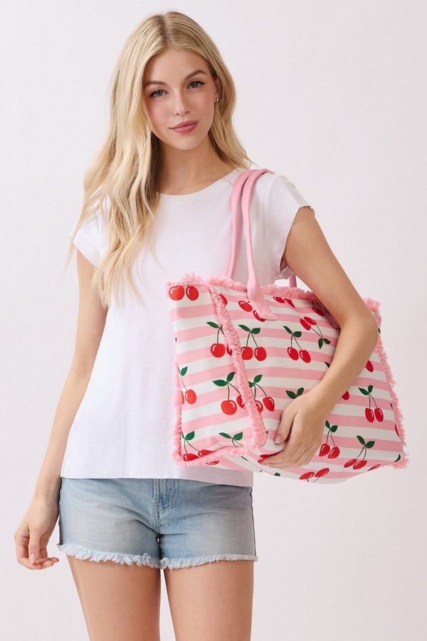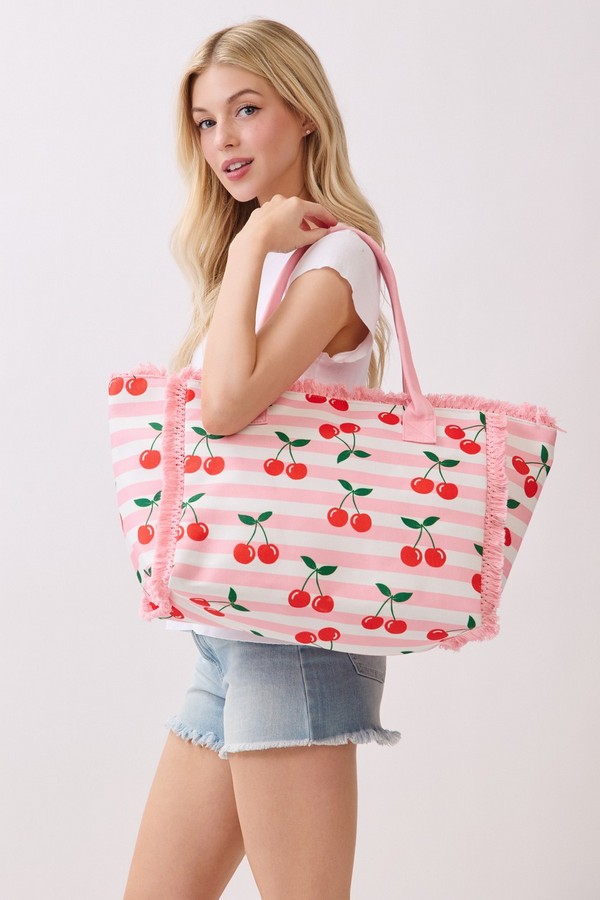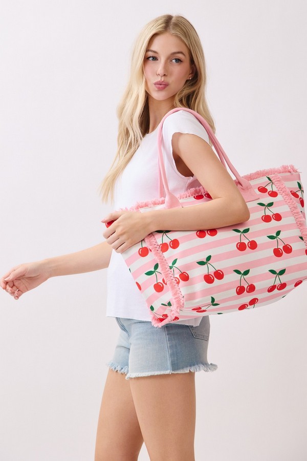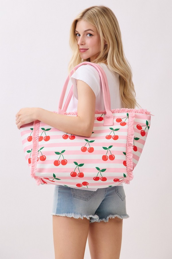 - * This Cherry Stripe Fringe Tote Bag from H&D Accessories features a playful fruit print set against a classic stripe base, accented with soft fringe trim and sturdy handles for comfortable carrying. Its spacious interior can easily hold your picnic snacks, sunglasses, and a light jacket, making it a charming pick for weekend farmers’ markets, brunch dates, or sunny days spent exploring the city.
