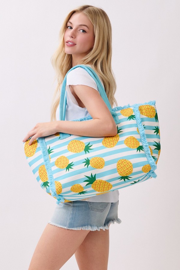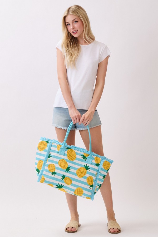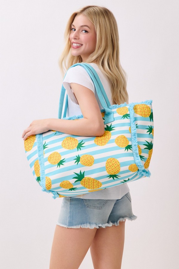 - * This Pineapple Stripe Fringe Tote Bag from H&D Accessories features a vibrant tropical fruit print on a classic stripe base, finished with soft fringe trim and durable handles for easy carrying. Its roomy interior can stow your beach towel, sunscreen, and a refreshing drink, making it a lively and practical companion for poolside lounging, tropical getaways, or casual summer shopping trips.
