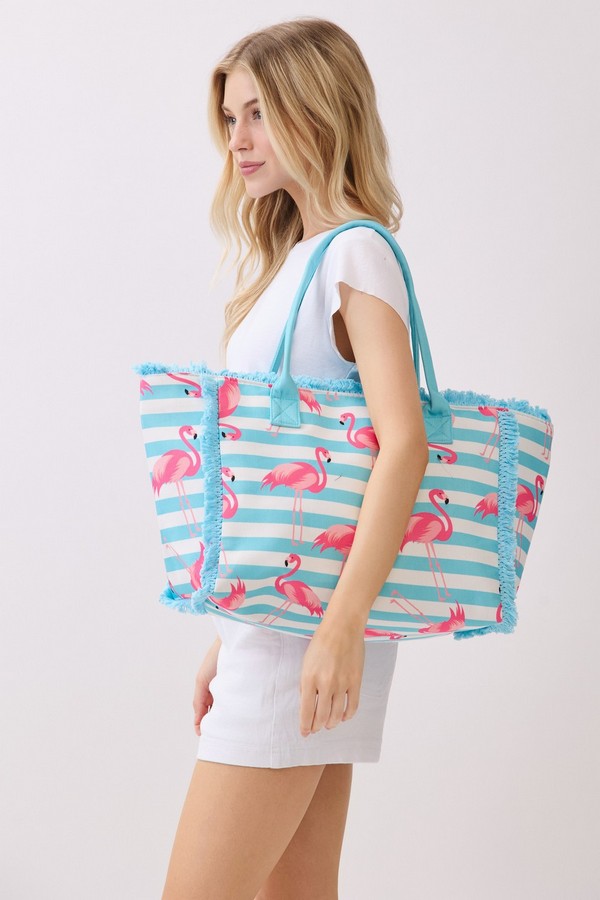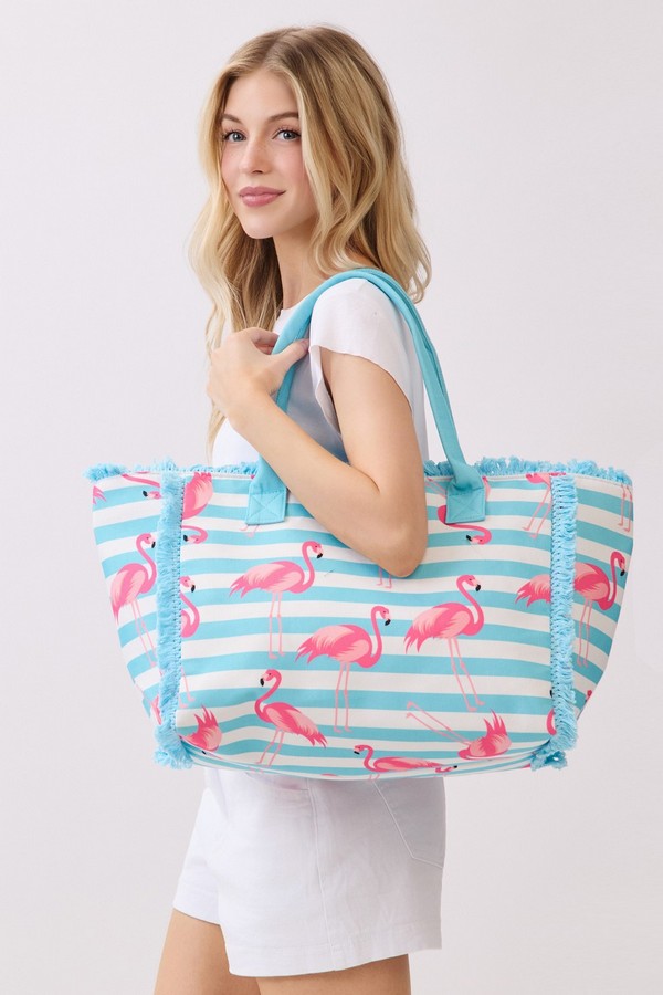 - * This Flamingo Stripe Fringe Tote Bag from H&D Accessories features a playful tropical bird print on a classic stripe base, accented with soft fringe trim and sturdy handles for comfortable carrying. Its spacious interior can easily hold your beach essentials, picnic supplies, or day-out necessities, making it a vibrant and practical choice for poolside days, tropical vacations, or casual weekend shopping trips.