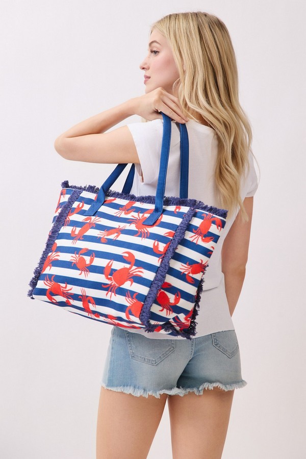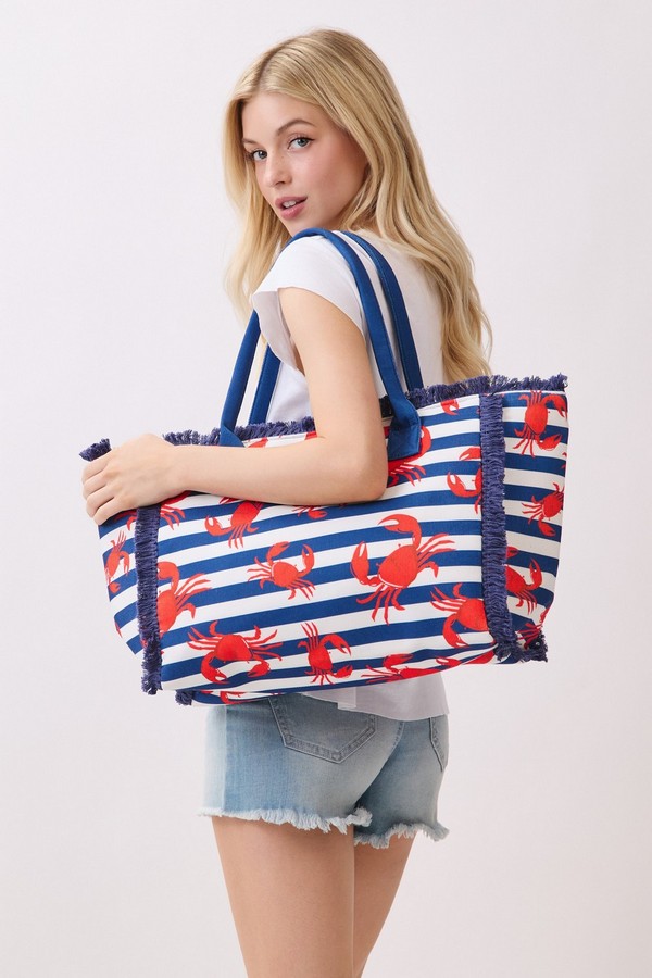 - * This Crab Stripe Fringe Tote Bag from H&D Accessories features a fun coastal-inspired crab print set against a classic stripe base, finished with soft fringe trim and durable handles for easy carrying. Its roomy interior can hold your beach towel, snacks, and sunscreen, making it a charming and practical companion for a day by the ocean, a boardwalk stroll, or a casual summer picnic by the water.