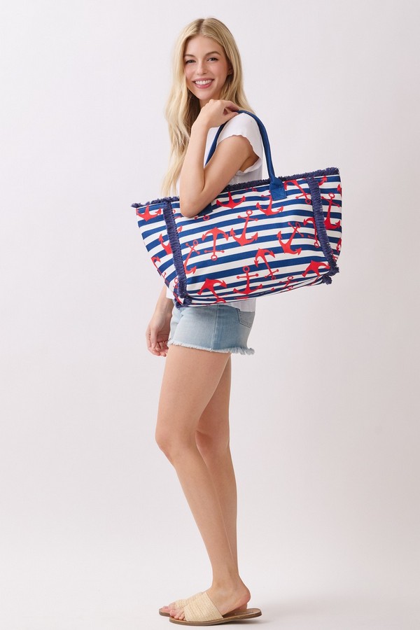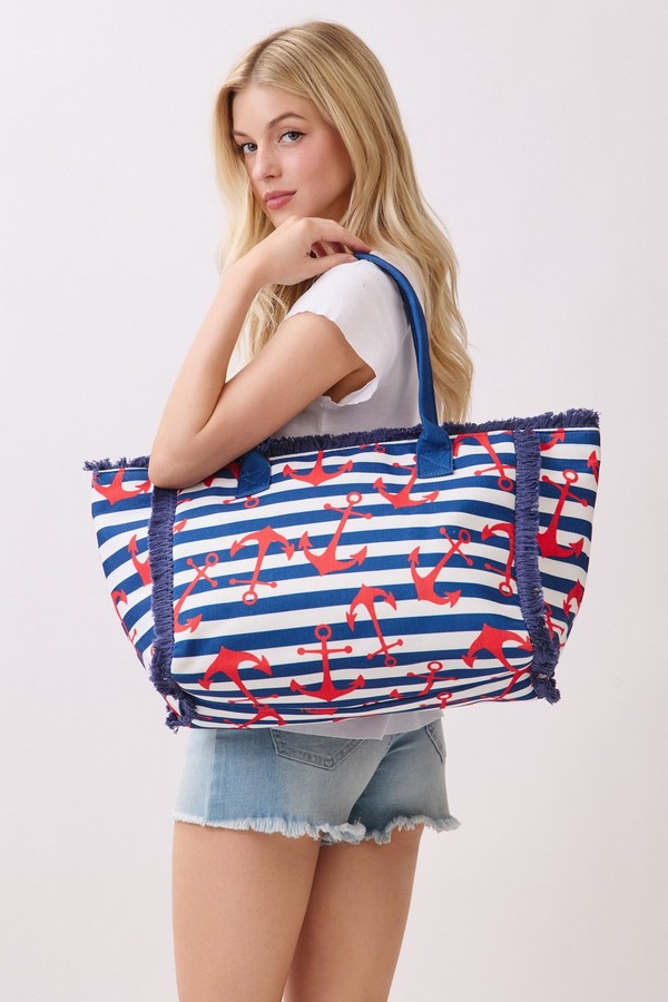 - * This Anchor Stripe Fringe Tote Bag from H&D Accessories features a nautical-themed anchor print on a classic stripe base, accented with soft fringe trim and sturdy handles for comfortable carrying. Its roomy interior can easily hold your beach towel, sunglasses, and a light jacket, making it a stylish and practical choice for coastal getaways, boardwalk walks, or casual weekend outings by the water.