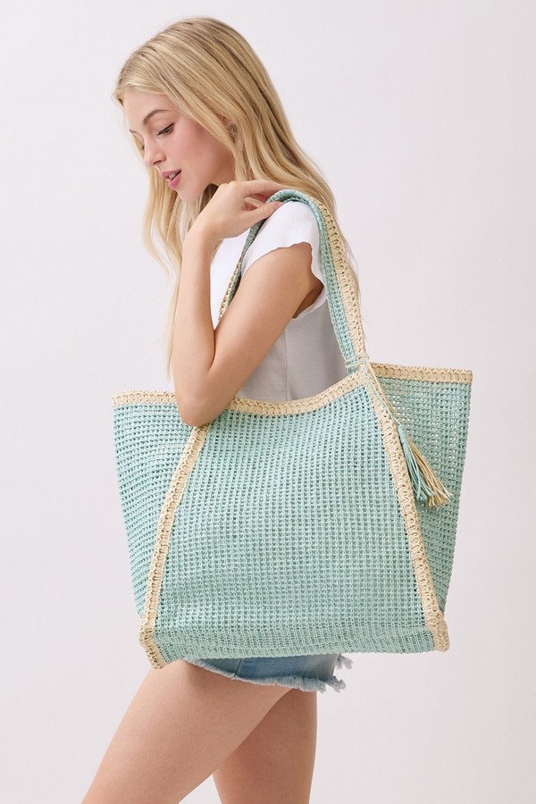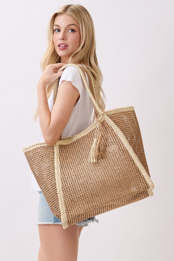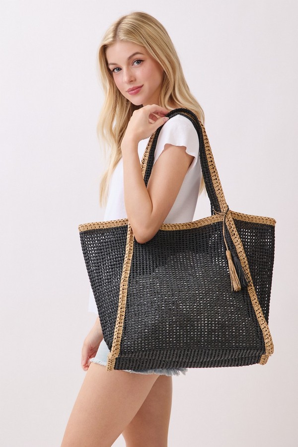 - * This is the Two Tone Woven Straw Tote Bag With Tassel from H&D Accessories. It features a textured woven construction with a two-tone design and a decorative tassel, giving it a sleek, casual appeal. It’s ideal for a day at the beach—you can store a folded towel, a sunscreen bottle, and a pair of flip-flops inside, while its breathable weave also makes it suitable for a post-beach walk to a waterfront café, letting you carry essentials with effortless, summery style that complements relaxed outdoor outfits.