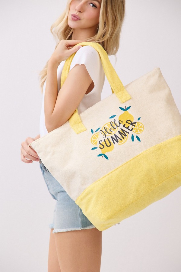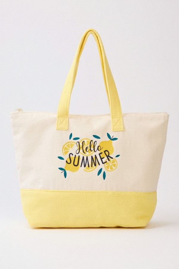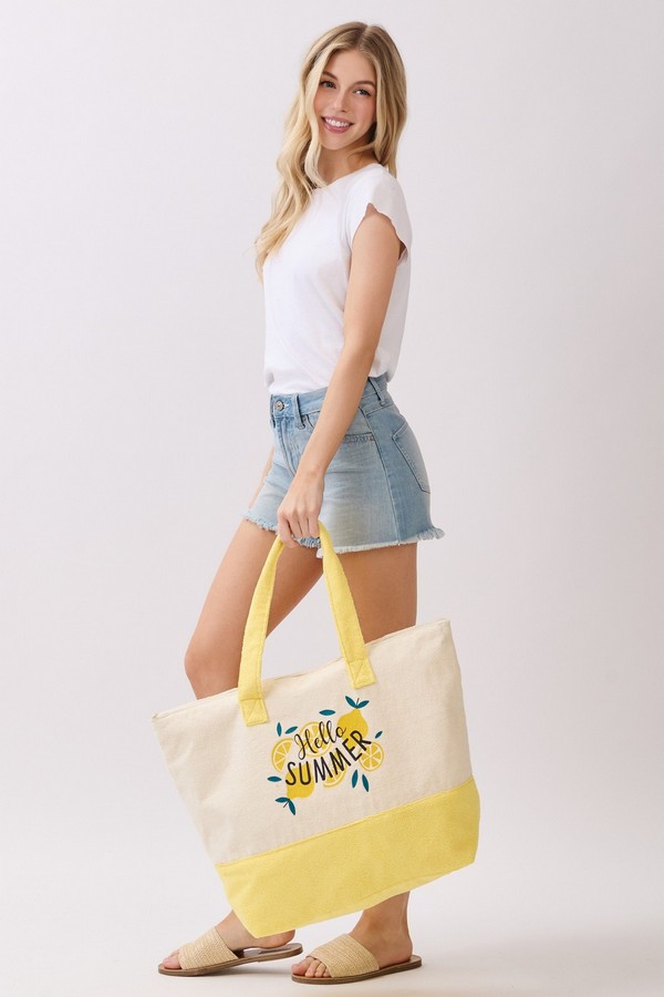 - * This is the Hello Summer Terry Tote from H&D Accessories, a textured carryall featuring a bright, summery graphic: the phrase "Hello Summer" is surrounded by lemon motifs and small leaves, creating a fresh, vibrant vibe that fits the warm season. It’s perfect for a trip to a farmers’ market—you can stow fresh produce, a reusable bag, and a cold drink, with the cheerful lemon design adding a playful touch to your errand run. It also works well as a tote for a casual brunch outing, blending its sunny, citrus-themed pattern with roomy, practical functionality to hold all your essentials.