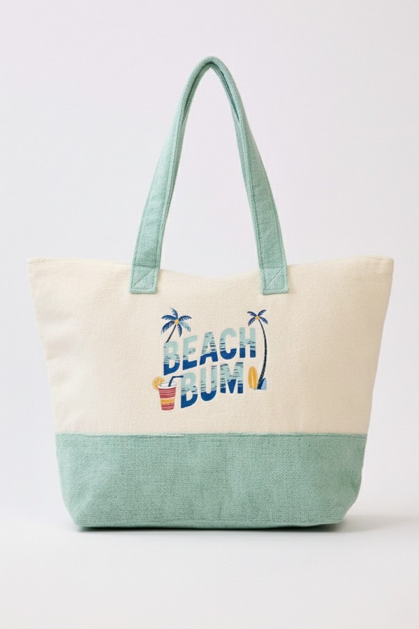 - * This is the Beach Bum Terry Tote from H&D Accessories, a textured carryall decorated with a lively coastal graphic: the phrase "BEACH BUM" is paired with two palm trees, plus a colorful drink and a surfboard motif, all capturing a laid-back, seaside spirit. It’s ideal for a day at the beach—you can pack a towel, sunscreen, and a snack, letting the playful, beach-themed design match the relaxed vibe of your outing. It also works well as a casual tote for a boardwalk stroll or a weekend getaway, merging its fun, tropical pattern with spacious, practical functionality to hold all your essentials.