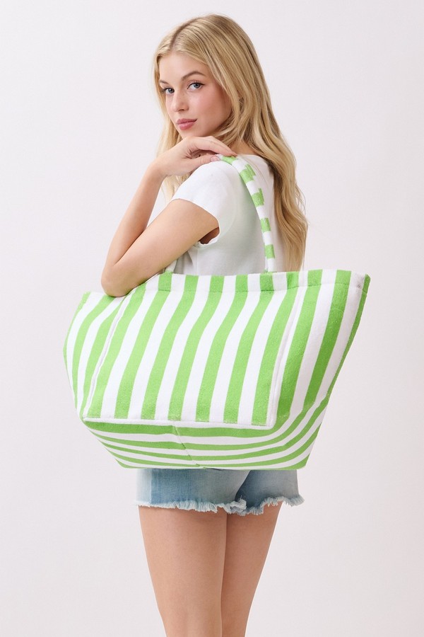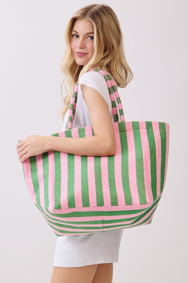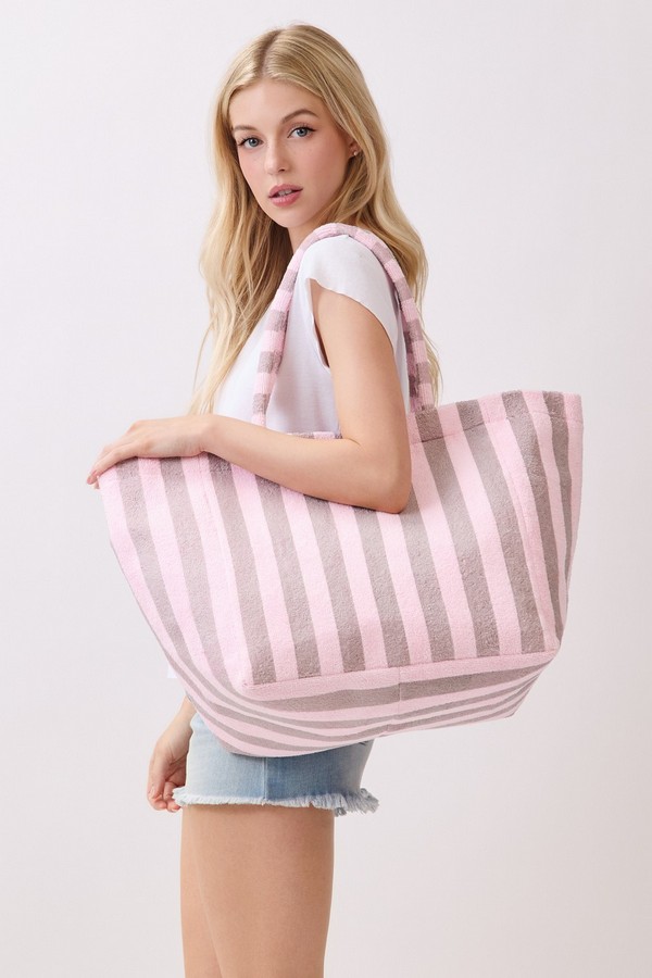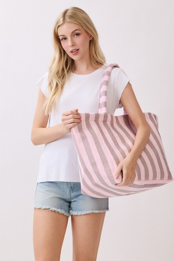 - * This is the Striped Terry Tote Bag from H&D Accessories, a textured carryall featuring a bold, vertical striped pattern that covers both the main body and the matching handle, creating a vibrant, eye-catching look. It’s perfect for a casual day out—you can pack a lightweight jacket, a notebook, and a water bottle when heading to a café or a weekend market, with the striped design adding a lively touch to your ensemble. It also works well as a daily tote for errands, merging its playful, patterned style with spacious, practical functionality to hold all your essentials.