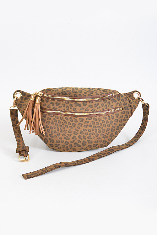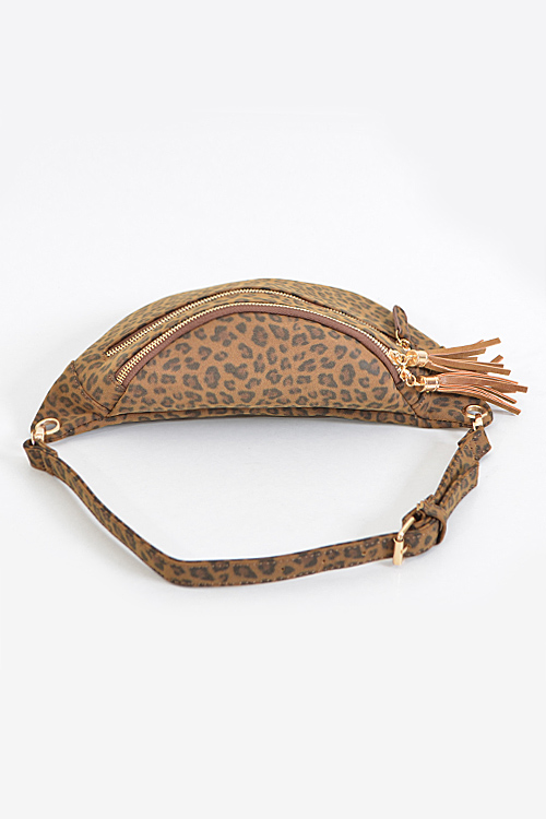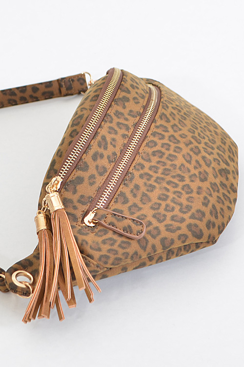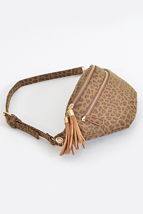 • * Leopard Fanny Pack With Tassels * 13.5W*6H * Polyurethane, mixed metal