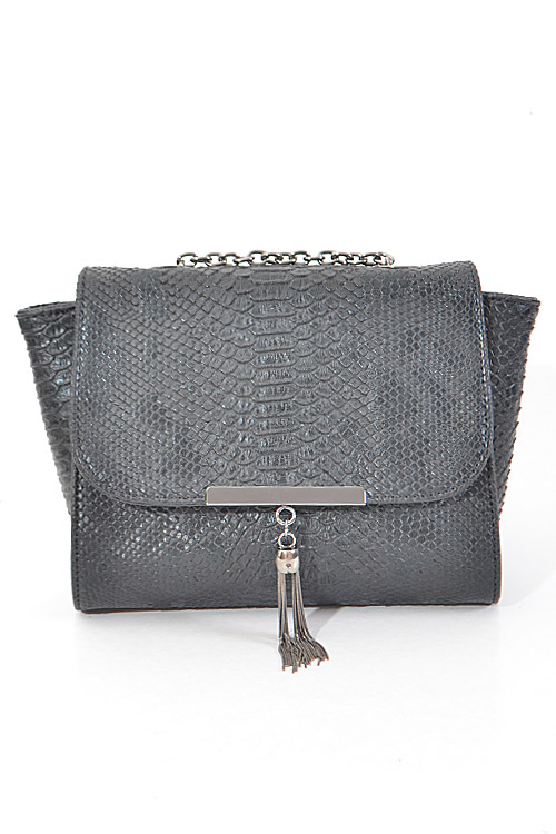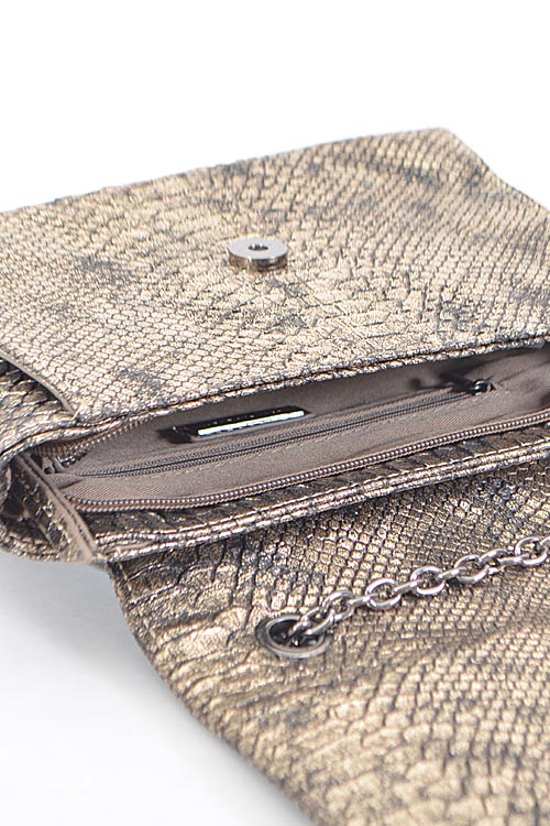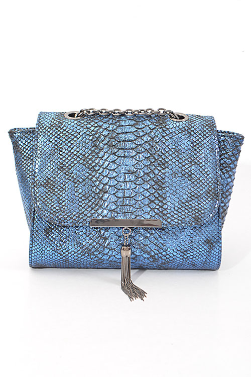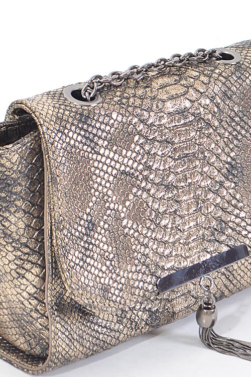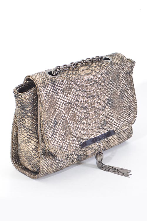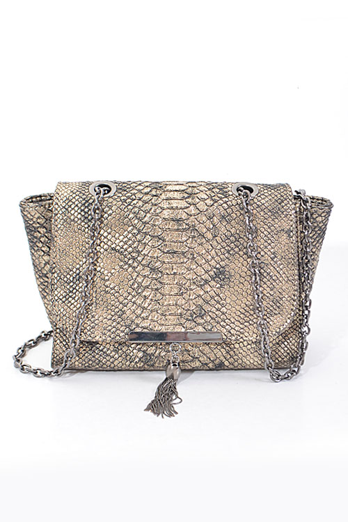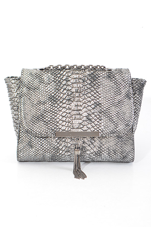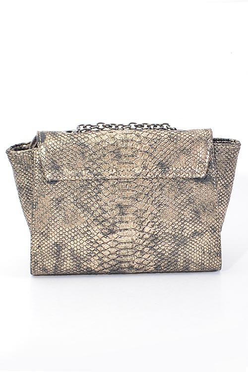 • * Faux Reptile Skin Inspired Chain Side Clutch * 10.5W*7H*2.5D * Polyurethane, mixed metal