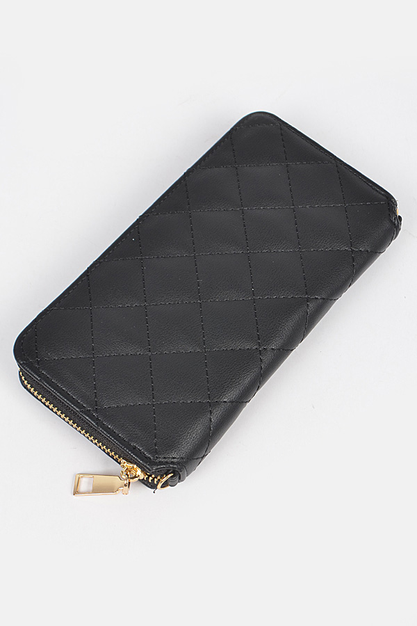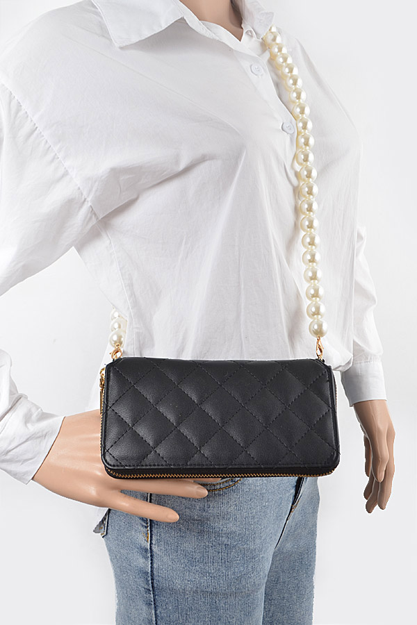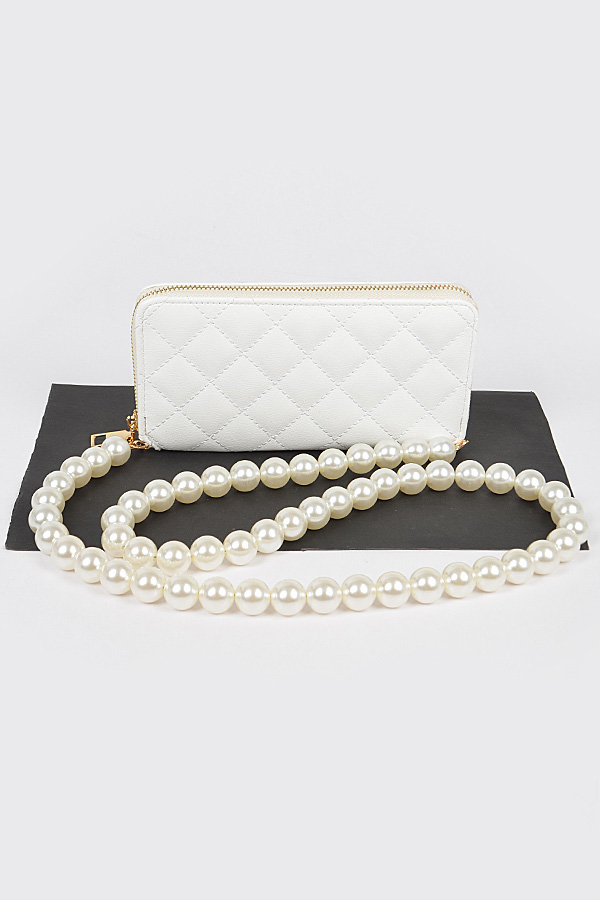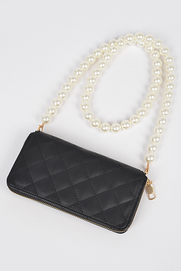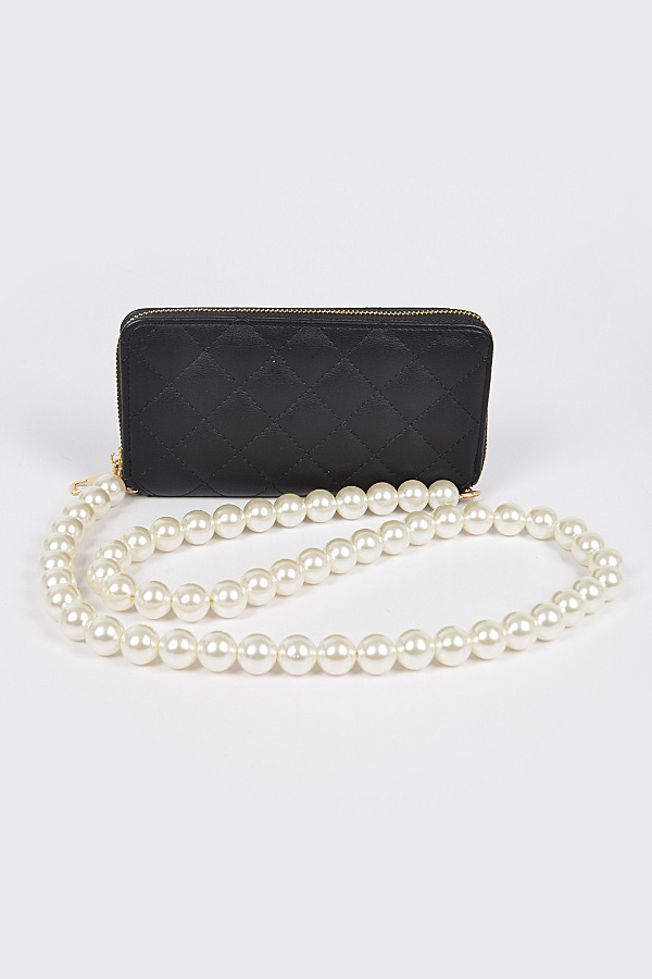 • * Faux Pearl Long Strap Crossbody Large Wallet