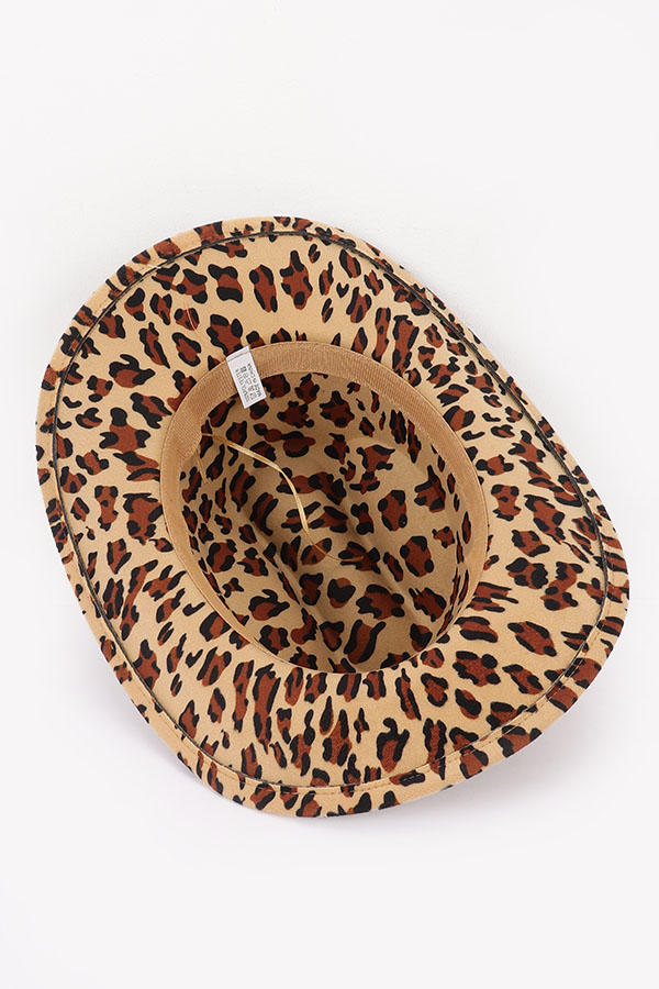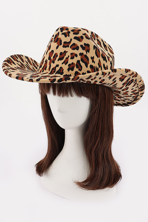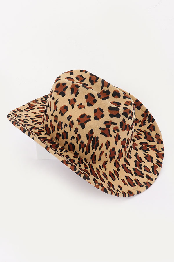 - * This Leopard Print Cowboy Hat from H&D Accessories features a classic cowboy hat silhouette with a leopard print pattern. The hat has a wide brim and a structured crown, giving it a bold and stylish appearance.