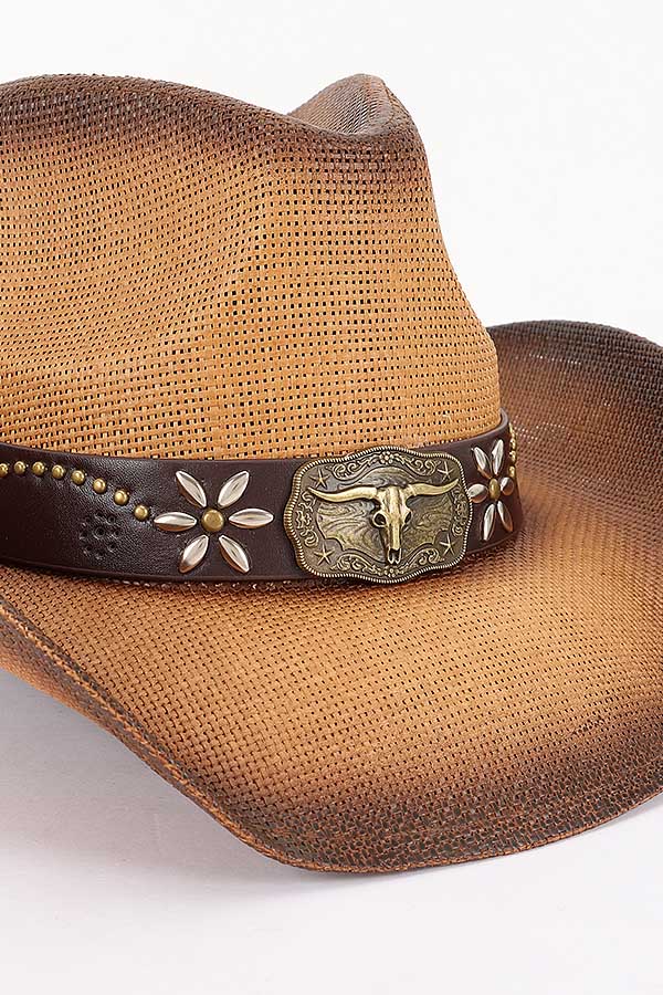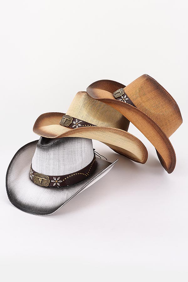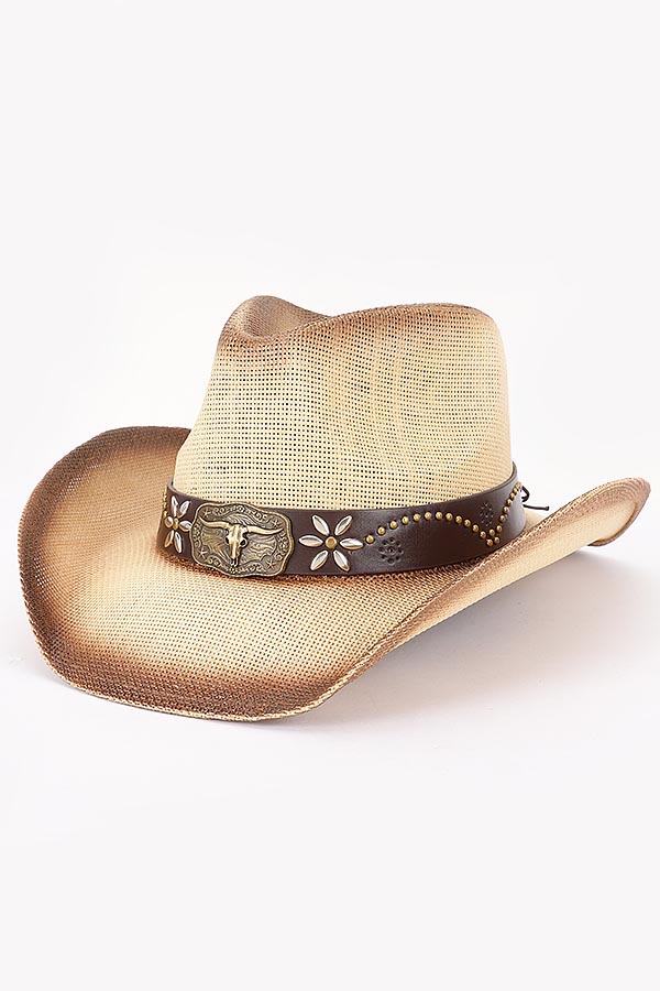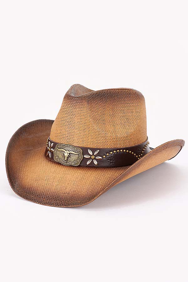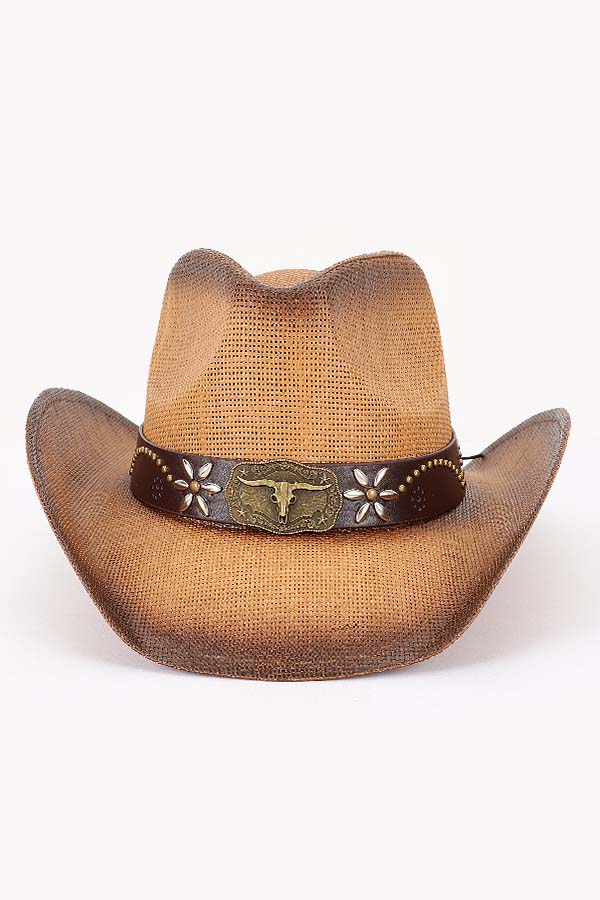 - * This is a Faux Straw Vintage Cowboy Hat from H&D Accessories. It features a classic cowboy silhouette with a textured, breathable faux straw construction and a wide brim that offers ample sun protection. Adorning the hat is a decorative band with intricate details, including a distinctive emblem and floral accents, adding a touch of rustic charm. Perfect for channeling western vibes, it's ideal for outdoor activities like country music festivals, ranch outings, or simply as a stylish statement piece to elevate your casual summer looks.