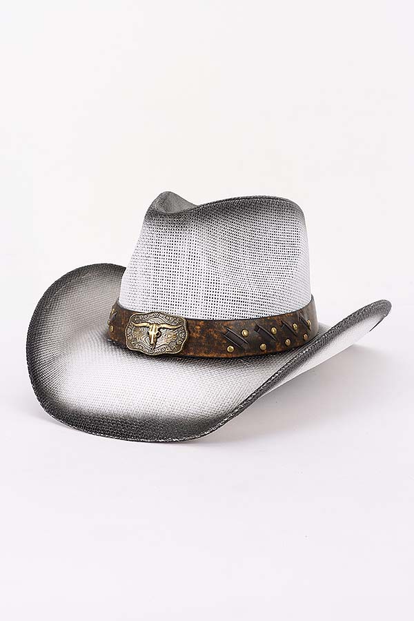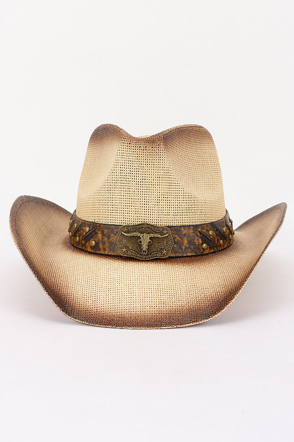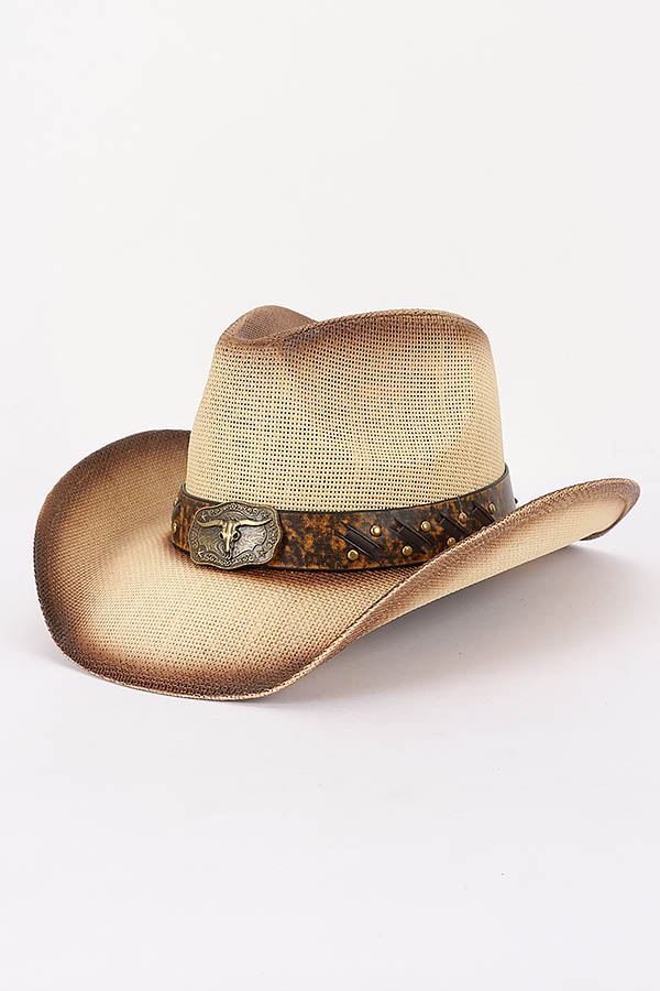 • * This is a Faux Straw Vintage Cowboy Hat from H&D Accessories. It features a classic cowboy hat silhouette with a faux straw construction and a decorative band adorned with a distinctive bullhead emblem and stud details. The hat is perfect for various scenarios—whether you’re heading to a country music festival, going on a western-themed adventure, or simply want to add a touch of rustic charm to your casual outfit, it serves as an ideal accessory. Its vintage-inspired design effortlessly captures the spirit of the Wild West, making it a standout piece that can elevate your style while also providing practical sun protection during outdoor activities.