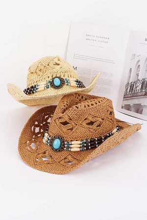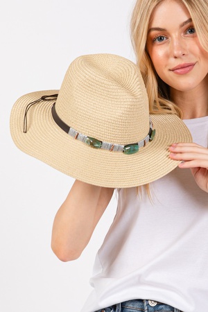TURQUOISE BEADS BAND STRAW SUN HAT.