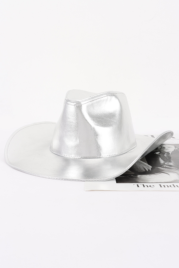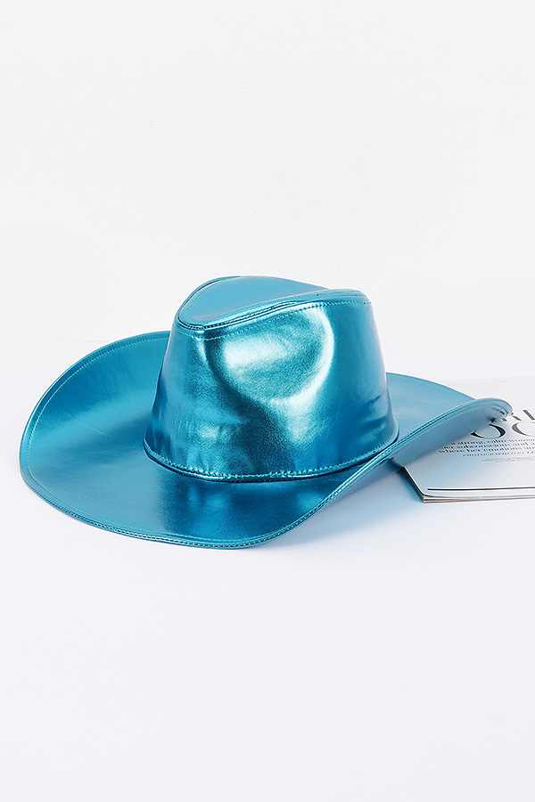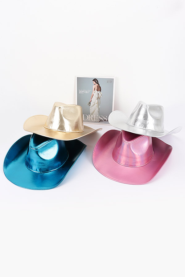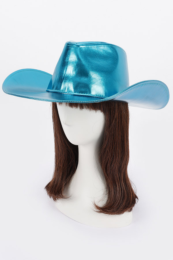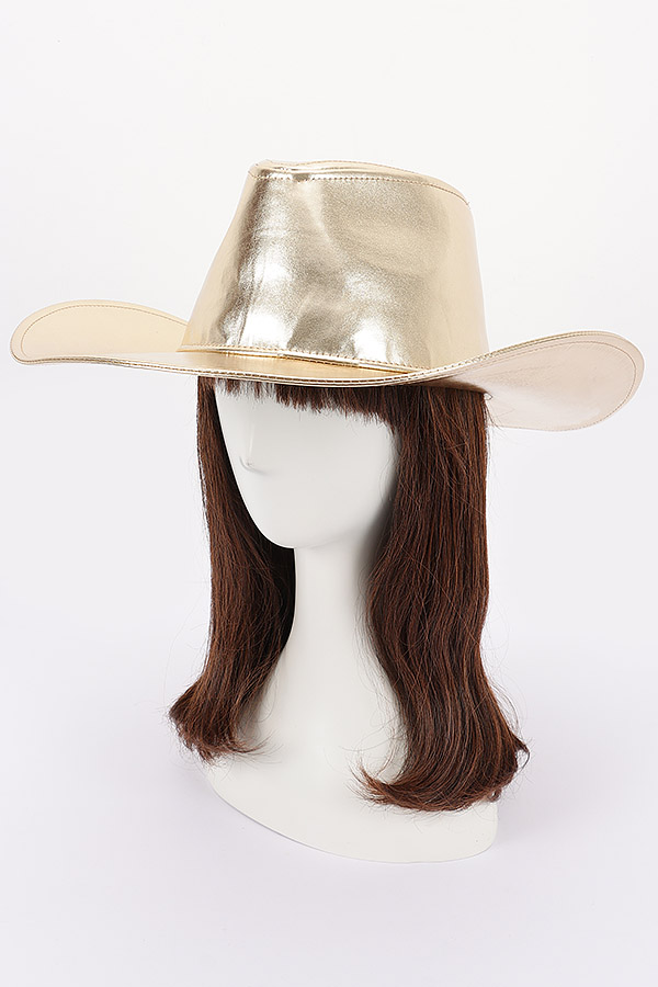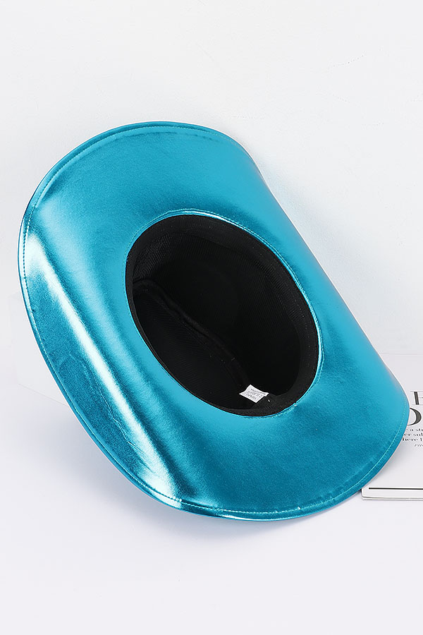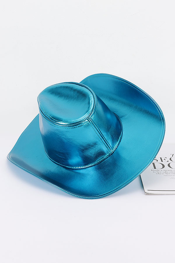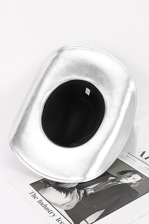 • * This Metallic Faux Leather Cowboy Hat from H&D Accessories is a stylish and eye - catching accessory. Crafted from metallic - finished faux leather, it features the classic cowboy hat silhouette with a wide brim and a tall crown, combining a Western - inspired look with a modern, edgy twist.