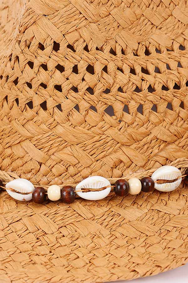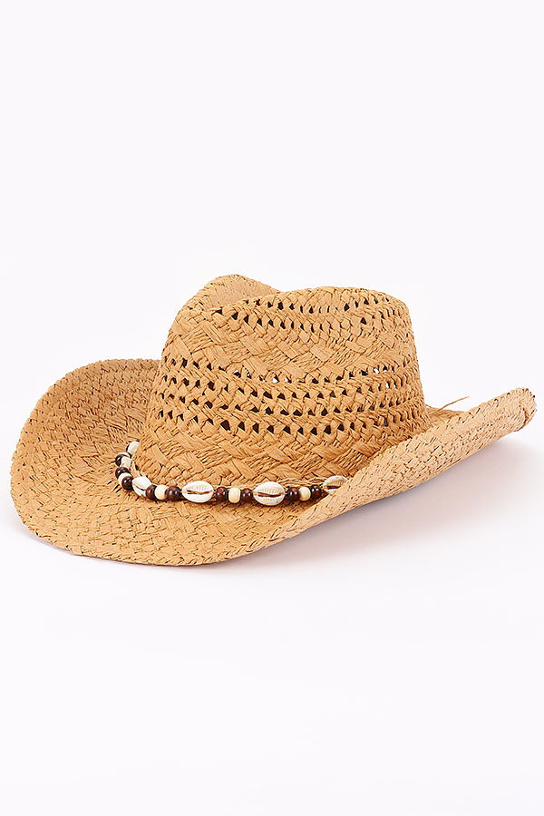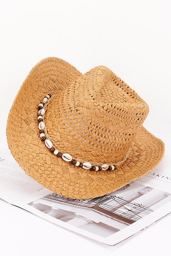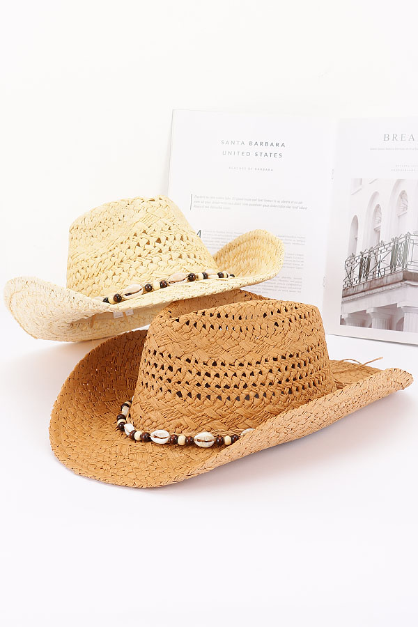 - * This Faux Straw Cowboy Hat from H&D Accessories features a classic cowboy hat design with a faux straw construction. It is adorned with a decorative band made of beads and shells, giving it a stylish and beachy look.