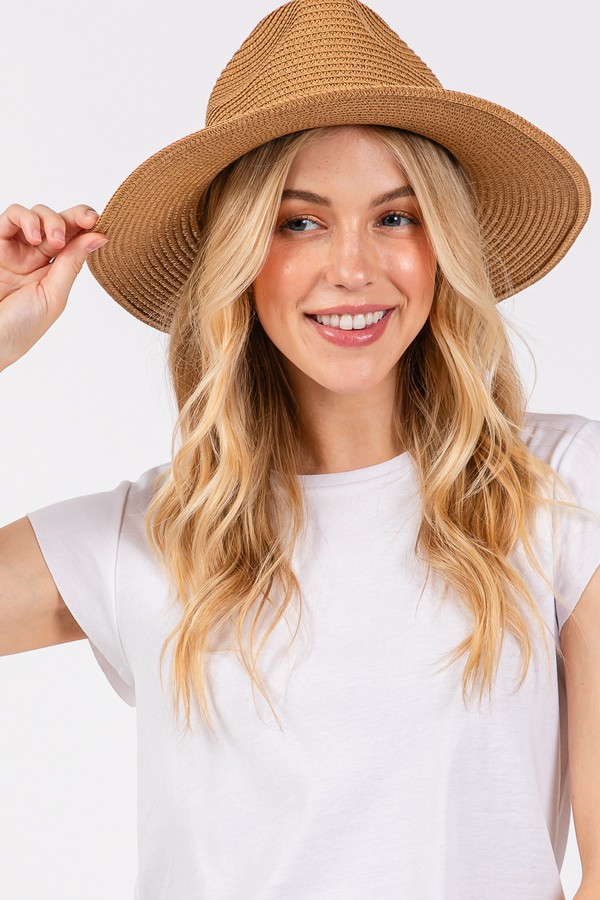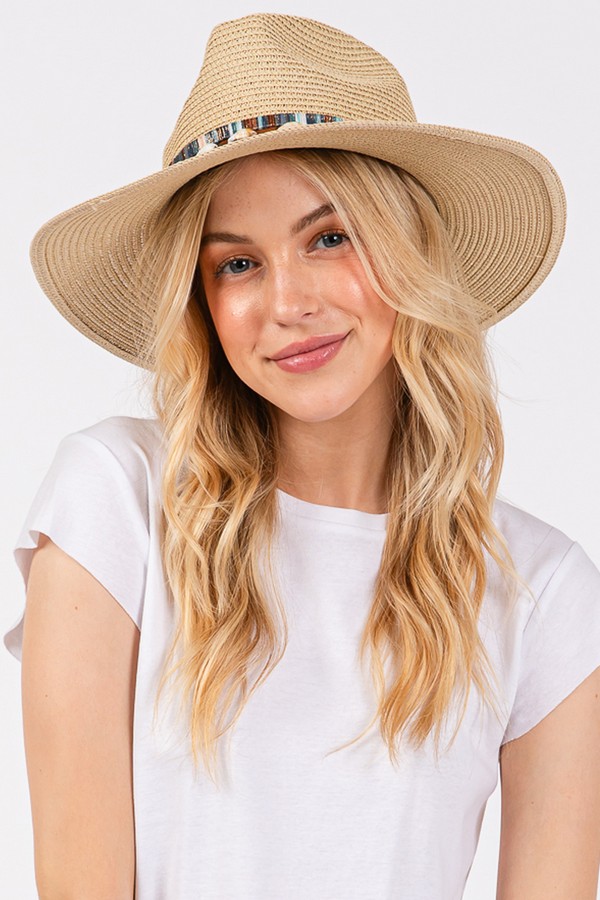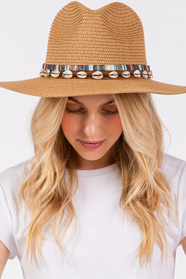 - * STRAW SUN HAT WITH SELL AND MULTI COLORED BAND.