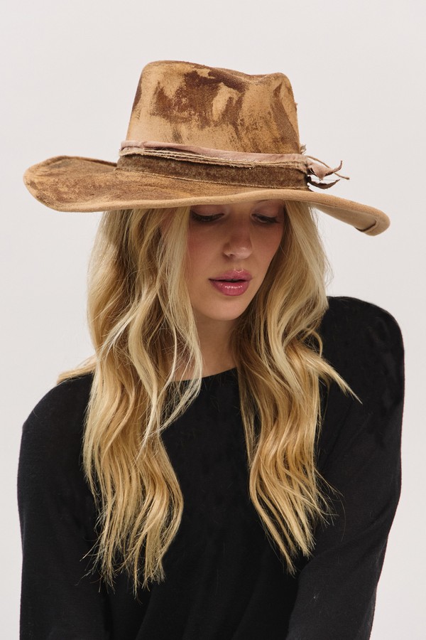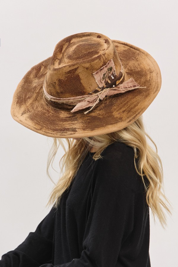 - * Vintage Versatile Shapeable Cowgirl & Fedora Hat With Feather & Distressed Fabric Band